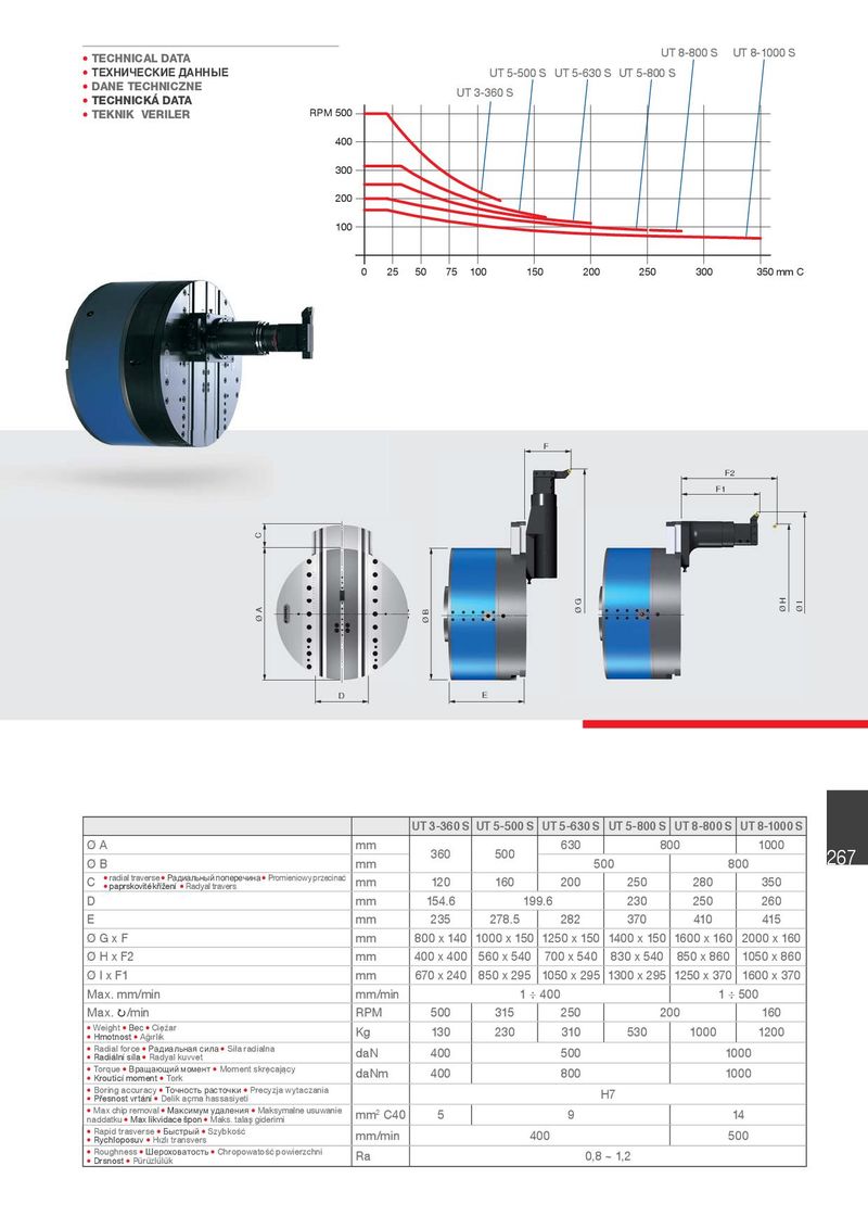 • TECHNICAL DATA UT 8-800 S UT 8-1000 S • ТЕХНИЧЕСКИЕ ДАННЫЕ UT 5-500 S UT 5-630 S UT 5-800 S • DANE TECHNICZNE UT 3-360 S • TECHNICKÁ DATA • TEKNIK VERILER RPM 500 400 300 200 100 0 25 50 75 100 150 200 250 300 350 mm C F F2 F1 C G ØH ØI A B Ø Ø Ø D E UT 3-360 S UT 5-500 S UT 5-630 S UT 5-800 S UT 8-800 S UT 8-1000 S ØA mm 360 500 630 800 1000 267 µ% mm 500 800 C •UDGLDOWUDYHUVH• Радиальный поперечина • 3URPLHQLRZ\SU]HFLQDġ mm 120 160 200 250 280 350 • SDSUVNRYLWÆNŦÊ{HQÊ •5DG\DOWUDYHUV D mm 154.6 199.6 230 250 260 E mm 235 278.5 282 370 410 415 ØGxF mm 800 x 140 1000 x 150 1250 x 150 1400 x 150 1600 x 160 2000 x 160 Ø H x F2 mm 400 x 400 560 x 540 700 x 540 830 x 540 850 x 860 1050 x 860 Ø I x F1 mm 670 x 240 850 x 295 1050 x 295 1300 x 295 1250 x 370 1600 x 370 0D[PPPLQ PPPLQ 1 ÷ 400 1 ÷ 500 Max. 3PLQ RPM 500 315 250 200 160 •:HLJKW• Вес •&LĸƅDU Kg 130 230 310 530 1000 1200 • Hmotnost •$ĽIJUOIJN • Radial force • Радиальная сила •6LŕDUDGLDOQD daN 400 500 1000 • 5DGL¾OQÊVÊOD •5DG\DONXYYHW • Torque • Вращающий момент •0RPHQWVNUĸFDMĝF\ daNm 400 800 1000 • .URXWLFÊPRPHQW•7RUN •%RULQJDFFXUDF\• Точность расточки •3UHF\]MDZ\WDF]DQLD H7 • 3ŦHVQRVWYUW¾QÊ •'HOLNDÄPDKDVVDVL\HWL •0D[FKLSUHPRYDO• Максимум удаления •0DNV\PDOQHXVXZDQLH mm2 C40 5 9 14 QDGGDWNX• 0D[OLNYLGDFHxSRQ•0DNVWDODūJLGHULPL •5DSLGWUDVYHUVH• Быстрый •6]\ENRŪġ PPPLQ 400 500 • 5\FKORSRVXY•+IJ]OIJWUDQVYHUV • Roughness • Шероховатость •&KURSRZDWRŪġSRZLHU]FKQL Ra 0,8 ~ 1,2 • Drsnost •3ÙUÙ]OÙOÙN