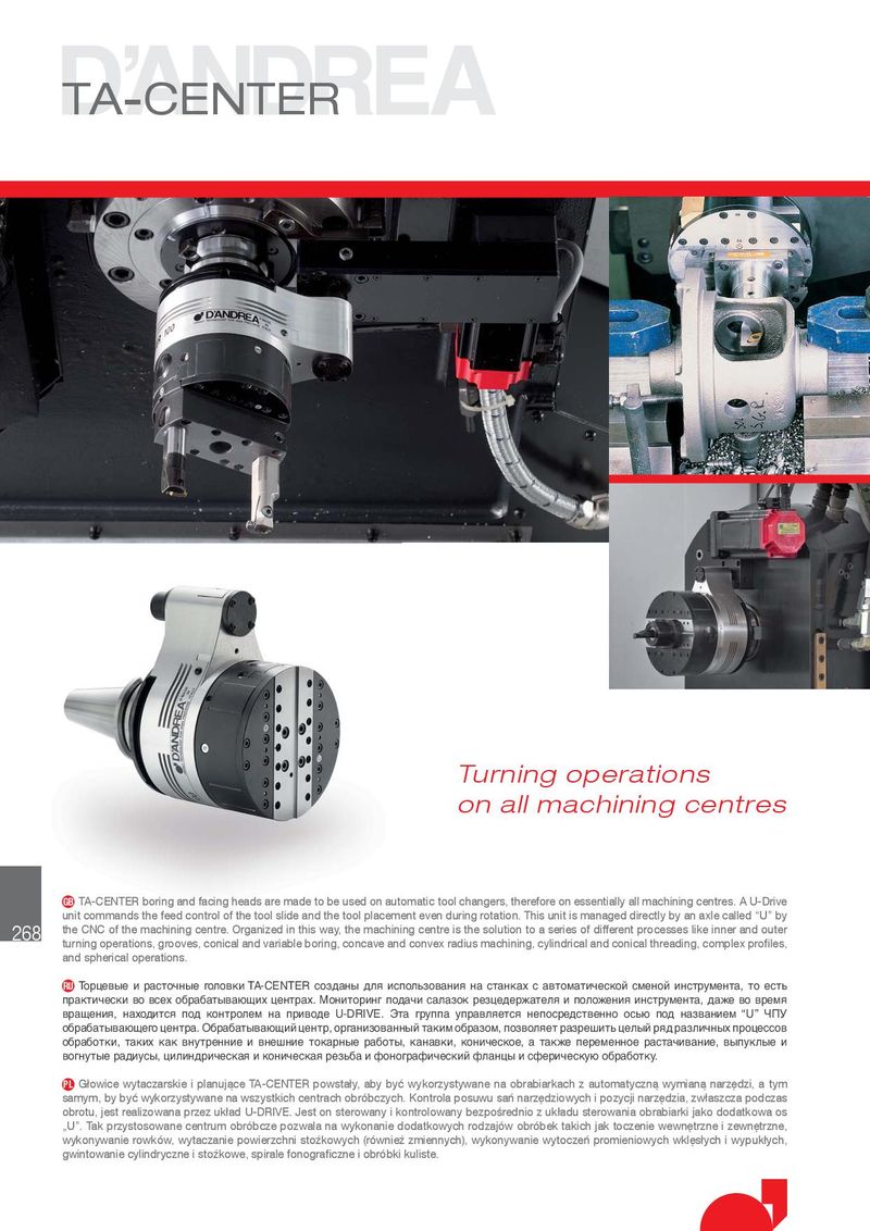 TA-CENTER Turning operations on all machining centres GB TA-CENTER boring and facing heads are made to be used on automatic tool changers, therefore on essentially all machining centres. A U-Drive unit commands the feed control of the tool slide and the tool placement even during rotation. This unit is managed directly by an axle called “U” by 268 the CNC of the machining centre. Organized in this way, the machining centre is the solution to a series of different processes like inner and outer WXUQLQJRSHUDWLRQVJURRYHVFRQLFDODQGYDULDEOHERULQJFRQFDYHDQGFRQYH[UDGLXVPDFKLQLQJF\OLQGULFDODQGFRQLFDOWKUHDGLQJFRPSOH[SURĺOHV and spherical operations. RU Торцевые и расточные головки TA-CENTER созданы для использования на станках с автоматической сменой инструмента, то есть практически во всех обрабатывающих центрах. Мониторинг подачи салазок резцедержателя и положения инструмента, даже во время вращения, находится под контролем на приводе U-DRIVE. Эта группа управляется непосредственно осью под названием “U” ЧПУ обрабатывающего центра. Обрабатывающий центр, организованный таким образом, позволяет разрешить целый ряд различных процессов обработки, таких как внутренние и внешние токарные работы, канавки, коническое, а также переменное растачивание, выпуклые и вогнутые радиусы, цилиндрическая и коническая резьба и фонографический фланцы и сферическую обработку. PL *ŕRZLFHZ\WDF]DUVNLHLSODQXMĝFH7$&(17(5SRZVWDŕ\DE\E\ġZ\NRU]\VW\ZDQHQDREUDELDUNDFK]DXWRPDW\F]QĝZ\PLDQĝQDU]ĸG]LDW\P VDP\PE\E\ġZ\NRU]\VW\ZDQHQDZV]\VWNLFKFHQWUDFKREUÐEF]\FK.RQWURODSRVXZXVDŘQDU]ĸG]LRZ\FKLSR]\FMLQDU]ĸG]LD]ZŕDV]F]DSRGF]DV REURWXMHVWUHDOL]RZDQDSU]H]XNŕDG8'5,9(-HVWRQVWHURZDQ\LNRQWURORZDQ\EH]SRŪUHGQLR]XNŕDGXVWHURZDQLDREUDELDUNLMDNRGRGDWNRZDRV e8r7DNSU]\VWRVRZDQHFHQWUXPREUÐEF]HSR]ZDODQDZ\NRQDQLHGRGDWNRZ\FKURG]DMÐZREUÐEHNWDNLFKMDNWRF]HQLHZHZQĸWU]QHL]HZQĸWU]QH Z\NRQ\ZDQLHURZNÐZZ\WDF]DQLHSRZLHU]FKQLVWRƅNRZ\FKUÐZQLHƅ]PLHQQ\FKZ\NRQ\ZDQLHZ\WRF]HŘSURPLHQLRZ\FKZNOĸVŕ\FKLZ\SXNŕ\FK JZLQWRZDQLHF\OLQGU\F]QHLVWRƅNRZHVSLUDOHIRQRJUDĺF]QHLREUÐENLNXOLVWH