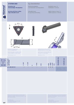 Bestellnummer part number C C -0.05 S +0.05 S R t max. Ø IK K10F CN45F AL41F P07C Klemmhalter Typ toolholder type SYSTEM DED Typ Stechdrehen Einstechen mit Wendeschneidplatte, Stechtiefe t max. 3.5 dreischneidigen Wendeplatten zum Einstechen und Längsdrehen Stechbreite C 3.29 mm grooving with three-cutting indexable insert, depth of groove t max. 3.5 edges indexable inserts for grooving and turning width of groove C 3.29 mm IK A A R t max. Rechts (R): wie gezeichnet righthand version (R): as shown Links (L): spiegelbildlich lefthand version (L): mirror image Rechte Schneidpl. in rechtem Halter use RH insert in RH tool holder and Linke Schneidpl. in linkem Halter LH insert in LH tool holder Abmessungen in mm dimensions in mm R/L .DED.3031.33 3.29 3.3 0.2 3.5 13.2 R/L .207. ∙∙∙∙ .3-D R/L .0.738. ∙∙∙∙ .3-D Weitere HM Sorten können Sie in der Sorten- More carbide grades you can find in the grades übersicht im Kapitel "Technische Hinweise" und summary in the chapter "technical instructions" der Preisliste finden. and in the price list. Bestellbeispiel: order-example: für rechte Ausführung und Sorte: righthand version and grade: 307 R.DED.3031.33/AL41F R.DED.3031.33/AL41F