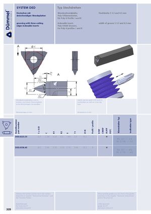 Bestellnummer part number C S ± 0.02 40° C R1 R2 E E ST1 Ø IK Profil / profile K10F CN45F AL41F P07C Klemmhalter Typ toolholder type SYSTEM DED Typ Stechdrehen Einstechen mit Wendeschneidplatte, Stechbreite S 3.3 und 4.3 mm dreischneidigen Wendeplatten Poly-V-Riemennuten, für Poly-V-Profile J und K grooving with three-cutting indexable insert, width of groove S 3.3 and 4.3 mm edges indexable inserts Poly-V-Belt Grooves, for Poly-V-profiles J and K A IK 5° A T1 R2 R1 R2 Wendeschneidplatten sind in inserts can be used in RH and LH rechten und linken Klemmhaltern toolholders as well as in boring sowie Bohrstangen verwendbar bars Abmessungen in mm dimensions in mm DED.0223.33 3.3 2.34 0.25 0.2 1.65 2.3 13.2 J R/L .207. ∙∙∙∙ .3-D R/L .0.738. ∙∙∙∙ .3-D DED.0356.43 4.3 3.56 0.35 0.25 2.15 3.69 13.2 K R/L .207. ∙∙∙∙ .4-D R/L .0.738. ∙∙∙∙ .4-D Weitere HM Sorten können Sie in der Sorten- More carbide grades you can find in the grades übersicht im Kapitel "Technische Hinweise" und summary in the chapter "technical instructions" der Preisliste finden. and in the price list. Bestellbeispiel: order-example: für Sorte AL41F: grade AL41F: 309 DED.0223.33/AL41F DED.0223.33/AL41F
