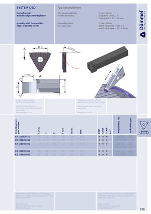 C RBestellnummerpart number C ±0.02 S R St max. D min. Ø IK K10F CN45F AL41F P07C Klemmhalter Typ toolholder type SYSTEM DED Typ Stechdrehen Einstechen mit Wendeschneidplatte, D min. 20 mm dreischneidigen Wendeplatten Axialbearbeitung Stechtiefe t max. 3.5 Stechbreite C 1.5 - 5.0 mm grooving with three-cutting indexable insert, D min. 20 mm edges indexable inserts face grooving depth of groove t max. 3.5 width of groove C 1.5 - 5.0 mm A IK D min. t max.R A Links (L): wie gezeichnet lefthand version (L): as shown Rechts (R): spiegelbildlich righthand version (R): mirror image Wendeschneidplatten sind in inserts can be used in RH and LH rechten und linken Klemmhaltern toolholders verwendbar Abmessungen in mm dimensions in mm R/L .DED.2015.2 1.5 2.7 0.2 2.0 20 13.2 (R/L .207. ∙∙∙∙ .2-D) R/L .DED.3020.2 2.0 2.7 0.2 3.0 30 13.2 R/L .0.738. ∙∙∙∙ .2-D R/L .DED.3030.2 3.0 3.7 0.2 3.0 30 13.2 (R/L .207. ∙∙∙∙ .3-D) R/L .0.738. ∙∙∙∙ .3-D R/L .DED.3040.2 4.0 4.3 0.2 3.5 30 13.2 (R/L .207. ∙∙∙∙ .4-D) R/L .DED.3050.2 5.0 5.3 0.2 3.5 30 13.2 R/L .0.738. ∙∙∙∙ .4-D Weitere HM Sorten können Sie in der Sorten- More carbide grades you can find in the grades übersicht im Kapitel "Technische Hinweise" und summary in the chapter "technical instructions" der Preisliste finden. and in the price list. Bestellbeispiel: order-example: für rechte Ausführung und Sorte: righthand version and grade: R.DED.2015.2/AL41F R.DED.2015.2/AL41F 310