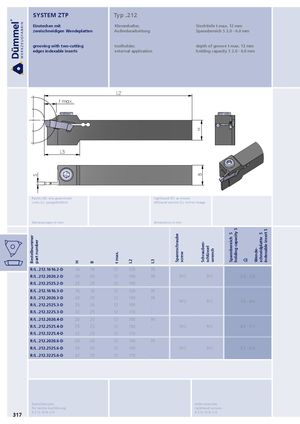 Bestellnummer S part number H B t max. L2 L3 Spannschraube screw HB Schrauben- schlüssel wrench SSpannbereich holding capacity S Wende- Sschneidplatte indexable insert S SYSTEM ZTP Typ .212 Einstechen mit Klemmhalter, Stechtiefe t max. 12 mm zweischneidigen Wendeplatten Außenbearbeitung Spannbereich S 2.0 - 6.0 mm grooving with two-cutting toolholder, depth of groove t max. 12 mm edges indexable inserts external application holding capacity S 2.0 - 6.0 mm L2 t max. L3 Rechts (R): wie gezeichnet righthand (R): as shown Links (L): spiegelbildlich lefthand version (L): mirror image Abmessungen in mm dimensions in mm R/L .212.1616.2-D 16 16 12 125 35 R/L .212.2020.2-D 20 20 12 150 35 912 911 2.0 - 3.0 R/L .212.2525.2-D 25 25 12 150 - R/L .212.1616.3-D 16 16 12 125 35 R/L .212.2020.3-D 20 20 12 150 35 912 911 3.0 - 4.0 R/L .212.2525.3-D 25 25 12 150 - R/L .212.3225.3-D 32 25 12 170 - R/L .212.2020.4-D 20 20 12 150 35 R/L .212.2525.4-D 25 25 12 150 - 912 911 4.0 - 5.1 R/L .212.3225.4-D 32 25 12 170 - R/L .212.2020.6-D 20 20 12 150 35 R/L .212.2525.6-D 25 25 12 150 - 912 911 5.2 - 6.0 R/L .212.3225.6-D 32 25 12 170 - Bestellbeispiel: order-example: für rechte Ausführung righthand version 317 R.212.1616.2-D R.212.1616.2-D
