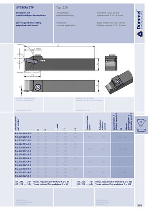 Bestellnummer part number S H B *t max. L2 L3 Spannschraube screw HB Schrauben- schlüssel wrench SSpannbereich holding capacity S Wende- Sschneidplatte indexable insert S SYSTEM ZTP Typ .220 Einstechen mit Klemmhalter, Stechtiefe t max. 20 mm zweischneidigen Wendeplatten Außenbearbeitung Spannbereich S 2.0 - 6.0 mm grooving with two-cutting toolholder, depth of groove t max. 20 mm edges indexable inserts external application holding capacity S 2.0 - 6.0 mm L2 t max. L3 Rechts (R): wie gezeichnet righthand (R): as shown Links (L): spiegelbildlich lefthand version (L): mirror image Abmessungen in mm dimensions in mm R/L .220.1616.2-D 16 16 20 125 45 R/L .220.2020.2-D 20 20 20 150 45 912 911 2.0 - 3.0 R/L .220.2525.2-D 25 25 20 150 - R/L .220.1616.3-D 16 16 20 125 45 R/L .220.2020.3-D 20 20 20 150 45 912 911 3.0 - 4.0 R/L .220.2525.3-D 25 25 20 150 - R/L .220.3225.3-D 32 25 20 170 - R/L .220.2020.4-D 20 20 20 150 45 R/L .220.2525.4-D 25 25 20 150 - 912 911 4.0 - 5.1 R/L .220.3225.4-D 32 25 20 170 - R/L .220.2020.6-D 20 20 20 150 45 R/L .220.2525.6-D 25 25 20 150 - 912 911 5.2 - 6.0 R/L .220.3225.6-D 32 25 20 170 - R/L .220. ∙∙∙∙ .2-D *tmax. reduziert bei Werkstück Ø > 50 R/L .220. ∙∙∙∙ .4-D *tmax. reduziert bei Werkstück Ø > 100 R/L .220. ∙∙∙∙ .3-D *tmax. reduced for workpiece Ø > 50 R/L .220. ∙∙∙∙ .6-D *tmax. reduced for workpiece Ø > 100 Bestellbeispiel: order-example: für rechte Ausführung righthand version R.220.1616.2-D R.220.1616.2-D 318