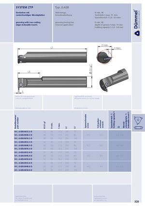 Bestellnummer part number Ø D1 g7 D min. t max. L2 L3 Spannschraube screw D1 g7 Schrauben- schlüssel wrench SSpannbereich holding capacity S Wende- Sschneidplatte indexable insert S SYSTEM ZTP Typ .0.428 Einstechen mit Bohrstange, D min. 46 zweischneidigen Wendeplatten Innenbearbeitung Stechtiefe t max. 15 mm Spannbereich S 2.0 - 6.0 mm grooving with two-cutting grooving boring bar, D min. 46 edges indexable inserts internal application depth of groove t max. 15 mm holding capacity S 2.0 - 6.0 mm D min. L2 t max. L3 S Rechts (R): wie gezeichnet righthand (R): as shown Links (L): spiegelbildlich lefthand version (L): mirror image Abmessungen in mm dimensions in mm R/L .0.428.0032.2-D 32 46 11.5 200 70 R/L .0.428.0040.2-D 40 50 11.5 250 80 912 911 2.0 - 3.0 R/L .0.428.0050.2-D 50 60 15.0 250 100 R/L .0.428.0032.3-D 32 46 11.5 200 70 R/L .0.428.0040.3-D 40 50 11.5 250 80 912 911 3.0 - 4.0 R/L .0.428.0050.3-D 50 60 15.0 250 100 R/L .0.428.0032.4-D 32 46 11.5 200 70 R/L .0.428.0040.4-D 40 50 11.5 250 80 912 911 4.0 - 5.1 R/L .0.428.0050.4-D 50 60 15.0 250 100 R/L .0.428.0032.6-D 32 46 11.5 200 70 R/L .0.428.0040.6-D 40 50 11.5 250 80 912 911 5.2 - 6.0 R/L .0.428.0050.6-D 50 60 15.0 250 100 Bestellbeispiel: order-example: für rechte Ausführung righthand version R.0.428.0032.2-D R.0.428.0032.2-D 320