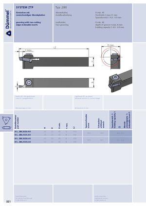 SBestellnummer part number H B D min. t max. L2 Spannschraube screw HB Schrauben- schlüssel wrench SSpannbereich holding capacity S Wende- Sschneidplatte indexable insert S SYSTEM ZTP Typ .280 Einstechen mit Klemmhalter, D min. 40 zweischneidigen Wendeplatten Axialbearbeitung Stechtiefe t max. 8 mm Spannbereich S 4.0 - 6.0 mm grooving with two-cutting toolholder, D min. 40 edges indexable inserts face grooving depth of groove t max. 8 mm holding capacity S 4.0 - 6.0 mm D min. L2 t max. Rechts (R): wie gezeichnet righthand (R): as shown Links (L): spiegelbildlich lefthand version (L): mirror image Abmessungen in mm dimensions in mm R/L .280.2020.4-D 20 20 40 8 150 912 911 4.0 - 5.1 R/L .280.2525.4-D 25 25 40 8 150 R/L .280.2020.6-D 20 20 40 8 150 912 911 5.2 - 6.0 R/L .280.2525.6-D 25 25 40 8 150 Bestellbeispiel: order-example: für rechte Ausführung righthand version 321 R.280.2020.4-D R.280.2020.4-D