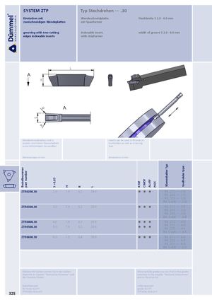 Bestellnummer part number S HR S +0.05 H R L K10F CN45F AL41F P07C Klemmhalter Typ toolholder type SYSTEM ZTP Typ Stechdrehen ∙∙∙∙ .30 Einstechen mit Wendeschneidplatte, Stechbreite S 2.0 - 6.0 mm zweischneidigen Wendeplatten mit Spanformer grooving with two-cutting indexable insert, width of groove S 2.0 - 6.0 mm edges indexable inserts with chipformer L A R A Wendeschneidplatten sind in inserts can be used in RH and LH rechten und linken Klemmhaltern toolholders as well as in boring sowie Bohrstangen verwendbar bars Abmessungen in mm dimensions in mm ZTP.0200.30 2.0 7.9 0.2 29.9 R/L .212. ∙∙∙∙ .2-D R/L .220. ∙∙∙∙ .2-D R/L .225. ∙∙∙∙ .2-D R/L .0.428. ∙∙∙∙ .2-D ZTP.0300.30 3.0 7.9 0.2 29.9 R/L .212. ∙∙∙∙ .3-D R/L .220. ∙∙∙∙ .3-D R/L .225. ∙∙∙∙ .3-D R/L .0.428. ∙∙∙∙ .3-D ZTP.0400.30 4.0 7.9 0.2 29.9 R/L .212. ∙∙∙∙ .4-D ZTP.0500.30 5.0 7.9 0.2 29.9 R/L .220. ∙∙∙∙ .4-DR/L .225. ∙∙∙∙ .4-D R/L .0.428. ∙∙∙∙ .4-D ZTP.0600.30 6.0 7.5 0.4 29.9 R/L .212. ∙∙∙∙ .6-D R/L .220. ∙∙∙∙ .6-D R/L .225. ∙∙∙∙ .6-D R/L .0.428. ∙∙∙∙ .6-D Weitere HM Sorten können Sie in der Sorten- More carbide grades you can find in the grades übersicht im Kapitel "Technische Hinweise" und summary in the chapter "technical instructions" der Preisliste finden. and in the price list. Bestellbeispiel: order-example: für Sorte AL41F: grade AL41F: 325 ZTP.0200.30/AL41F ZTP.0200.30/AL41F