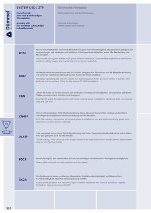 SYSTEM DED / ZTP Technische Hinweise Einstechen mit Hartmetallsorten und Beschichtungen zwei- und dreischneidigen Wendeplatten grooving with Technical instructions, two and three-cutting edges carbide grades and coatings indexable inserts Universell einsetzbares Feinkornhartmetall mit guter Verschleißfestigkeit. Unbeschichtet geeignet für K10F Anwendungen mit niedrigen und mittleren Schnittgeschwindigkeiten, sowie die Bearbeitung vonNE-Metallen. All purpose micrograin carbide with good abrasion resistance. Uncoated for applications with low or medium cutting speeds and machining of non-ferrous materials. Unbeschichtete Hartmetallsorte mit 6% Kobalt. Geeignet für Aluminium und NE-Metallbearbeitung, K06P mit polierter Spanfläche. (Aktuell nur für System DT MAX erhätlich.) Uncoated carbide grade with 6% cobalt. For machining aluminium and non-ferrous materials, with polished cutting surface. (Only for the system DT MAX available.) Zähe CBN-Sorte für Anwendungen mit niedrigen Schnittgeschwindigkeiten. Geeignet für gehärtete CBN Stähle, unterbrochene Schnitte und Grauguss. Ductile CBN grade for applications with lower cutting speed. Suitable for hardened steel, interrupted cuts and cast iron. Universell einsetzbare PVD-TIN-Beschichtung. Diese Allround-Sorte ist für niedrige und mittlere CN45F Schnittgeschwindigkeiten mit Einschränkung bei NE-Metallen. PVD-TIN coating - all purpose, all around grade is suitable for low and medium cutting speed with restrictions on non-ferrous materials. Sehr universell einsetzbare TIALN-Beschichtung mit hoher Temperaturbeständigkeit bei hoher Härte. AL41F Sehr gut geeignet auch für NE-Metalle. TIALN coating - very universal with a high resistance to high temperature and hardness. Very suitable also for non-ferrous metals. PD2F Beschichtung für den universellen Einsatz bei niedrigen und mittleren Schnittgeschwindigkeiten. Coating for universal use with medium and low speed. Beschichtung mit einer excellenten Warmhärte, Oxidationsbeständigkeit und thermischen XC2A Isolationsfähigkeit. Ideal für Hartzerspanung >60HRC Coating with excellent hot hardness, high oxidation resistance and thermal insulation capacity. Perfect for hard machining >60 HRC. 331