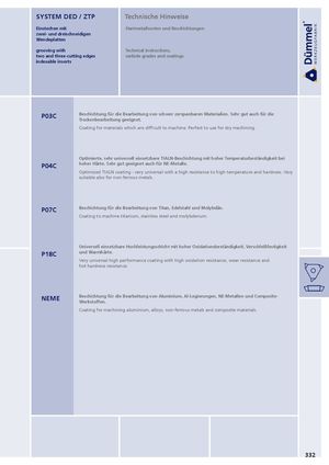 SYSTEM DED / ZTP Technische Hinweise Einstechen mit Hartmetallsorten und Beschichtungen zwei- und dreischneidigen Wendeplatten grooving with Technical instructions, two and three-cutting edges carbide grades and coatings indexable inserts P03C Beschichtung für die Bearbeitung von schwer zerspanbaren Materialien. Sehr gut auch für dieTrockenbearbeitung geeignet. Coating for materials which are difficult to machine. Perfect to use for dry machining. Optimierte, sehr universell einsetzbare TIALN-Beschichtung mit hoher Temperaturbeständigkeit bei P04C hoher Härte. Sehr gut geeignet auch für NE-Metalle. Optimized TIALN coating - very universal with a high resistance to high temperature and hardness. Very suitable also for non-ferrous metals. P07C Beschichtung für die Bearbeitung von Titan, Edelstahl und Molybdän. Coating to machine titanium, stainless steel and molybdenum. Universell einsetzbare Hochleistungsschicht mit hoher Oxidationsbeständigkeit, Verschleißfestigkeit P18C und Warmhärte. Very universal high performance coating with high oxidation resistance, wear resistance and hot hardness resistance. NEME Beschichtung für die Bearbeitung von Aluminium, Al-Legierungen, NE-Metallen und Composite-Werkstoffen. Coating for machining aluminium, alloys, non-ferrous metals and composite materials. 332