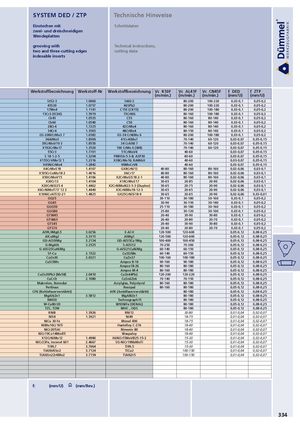 SYSTEM DED / ZTP Technische Hinweise Einstechen mit Schnittdaten zwei- und dreischneidigen Wendeplatten grooving with Technical instructions, two and three-cutting edges cutting data indexable inserts Werkstoffbezeichnung Werkstoff-Nr Werkstoffbezeichnung Vc K10F Vc AL41F Vc CN45F f DED f ZTP (m/min.) (m/min.) (m/min.) (mm/U) (mm/U) St52-3 1.0060 St60-2 80-200 100-220 0,03-0,1 0,05-0,2 45S20 1.0757 46SPb2 80-200 100-220 0,03-0,1 0,05-0,2 17Mn4 1.1141 C15E (CK15) 80-200 100-180 0,03-0,1 0,05-0,2 13Cr3 (EC60) 1.5919 15CrNi6 80-160 100-180 0,03-0,1 0,05-0,2 Ck45 1.0535 C55 80-160 80-140 0,03-0,1 0,05-0,2 Ck60 1.0540 C50 80-160 80-140 0,03-0,1 0,05-0,2 28Cr4 1.7225 42CrMo4 80-160 80-140 0,03-0,1 0,05-0,2 34Cr4 1.3565 48CrMo4 80-150 80-140 0,03-0,1 0,05-0,2 GS-20NiCrMo3 7 1.6582 GS-34 CrNiMo 6 80-200 100-180 0,03-0,1 0,05-0,2 34AlMo5 1.8509 41CrAlMo7 70-140 60-120 0,03-0,07 0,05-0,15 39CrMoV19 3 1.8550 34 CrAlNi 7 70-140 60-120 0,03-0,07 0,05-0,15 X192CrMo17 1.3520 100 CrMn 6 (W4) 70-140 60-120 0,03-0,07 0,05-0,15 55Cr3 1.7701 51CrMoV4 40-60 0,03-0,07 0,05-0,15 S 18-1-2-5 1.3294 PMHS6-5-3-8; ASP30 40-60 0,03-0,07 0,05-0,15 X155CrVMo12 1 1.2316 X38CrMo16; RAMAX 40-60 0,03-0,07 0,05-0,15 X45NiCrMo4 1.2842 90MnCrV8 40-60 0,03-0,07 0,05-0,15 X4CrMoS18 1.4107 GX8CrNi12 40-80 80-160 80-160 0,02-0,06 0,03-0,1 X105CrCoMo18 2 1.4016 X6Cr17 40-80 80-160 80-160 0,02-0,06 0,03-0,1 X50CrMoV15 1.4106 X2CrMoSiS18-2-1 40-80 80-160 80-160 0,02-0,06 0,03-0,1 X30Cr13 1.4104 X14CrMoS17 30-65 20-85 20-90 0,02-0,06 0,03-0,1 X20CrNiSi25 4 1.4462 X2CrNiMoN22-5-3 (Duplex) 30-65 20-75 20-90 0,02-0,06 0,03-0,1 X6CrNiMoTi17 12 2 1.4449 X3CrNiMo18-12-3 30-65 20-65 20-90 0,02-0,06 0,03-0,1 X10NiCrAlTi32-21 1.4825 GX25CrNiSi18-9 30-65 20-65 20-90 0,02-0,06 0,03-0,01 GG25 30-110 30-180 30-160 0,03-0,1 0,05-0,2 GG45 30-90 30-150 30-140 0,03-0,1 0,05-0,2 GGG50 25-110 30-180 30-160 0,03-0,1 0,05-0,2 GGG80 25-80 30-120 30-100 0,03-0,1 0,05-0,2 GTW45 20-40 30-90 30-80 0,03-0,1 0,05-0,2 GTW65 20-40 20-80 20-70 0,03-0,1 0,05-0,2 GTS45 20-40 30-90 30-80 0,03-0,1 0,05-0,2 GTS70 20-40 20-80 20-70 0,03-0,1 0,05-0,2 Al99,9Mg0,5 3.0256 E-Al H 120-500 120-600 0,05-0,12 0,08-0,25 AlCuMg2 3.3315 AlMg1 120-500 120-600 0,05-0,12 0,08-0,25 GD-AlSi9Mg 3.2134 GD-AlSi5Cu1Mg 100-400 100-450 0,05-0,12 0,08-0,25 G-MgAl6 3.2525 S-AlSi12 70-250 70-300 0,05-0,12 0,08-0,25 G-AlSi25CuNiMg G-AlSi21CuNiMg 60-140 60-150 0,05-0,12 0,08-0,25 SF-Cu 2.1522 CuSl2Mn 60-140 60-150 0,05-0,12 0,08-0,25 CuZn30 2.0321 CuZn37 100-160 100-180 0,05-0,12 0,08-0,25 CuSi3Mn Ampco 8-16 90-160 90-180 0,05-0,12 0,08-0,25 Ampco18-26 80-160 80-180 0,05-0,12 0,08-0,25 Ampco M-4 80-160 80-180 0,05-0,12 0,08-0,25 CuZn39Pb2 (Ms58) 2.0410 CuZn44Pb2 120-200 120-220 0,05-0,12 0,08-0,25 CuCrZr 2.1080 CuSn6Zn6 70-140 70-150 0,05-0,12 0,08-0,25 Makrolon, Novodur Acrylglas, Polystyrol 80-160 80-180 0,05-0,12 0,08-0,25 Pertinax Resopal 80-160 80-180 0,05-0,12 0,08-0,25 CFK (Kohlefaserverstärkt) AFK (Amidfaserverstärkt) 80-180 0,05-0,12 0,08-0,25 MgAl6Zn1 3.5812 MgAl8Zn1 80-180 0,05-0,12 0,08-0,25 R8650 Technograph15 80-180 0,05-0,12 0,08-0,25 W-Cu80/20 W93NiFe (DENAL) 80-180 0,05-0,12 0,08-0,25 TZC, TZM MHC , ODS 80-180 0,05-0,12 0,08-0,25 RNi8 1.3926 RNi12 30-80 0,01-0,04 0,02-0,07 Ni54 1.3921 Ni49 18-75 0,01-0,04 0,02-0,07 NiCu 30 Fe Monel 400 18-75 0,01-0,04 0,02-0,07 NiMo16Cr16Ti Hastelloy C-276 18-40 0,01-0,04 0,02-0,07 NiCr20TiAl Nimonic 80 18-40 0,01-0,04 0,02-0,07 NiCr19Co14Mo4Ti Waspaloy 18-40 0,01-0,04 0,02-0,07 X12CrNiMo12 1.4980 X6NiCrTiMoVB25-15-2 15-30 0,01-0,04 0,02-0,07 NiCr23Fe, Inconel 601 2.4667 SG-NiCr19NbMoTi 15-30 0,01-0,04 0,02-0,07 Ti99,7 3.7064 Ti99,5 15-30 0,01-0,04 0,02-0,07 TiAl6V6Sn2 3.7124 TiCu2 100-150 0,01-0,04 0,02-0,07 TiAl6Sn2Zr4Mo2 3.7154 TiAl6Zr5 100-150 0,01-0,04 0,02-0,07 f: (mm/U) (mm/Rev.) 334
