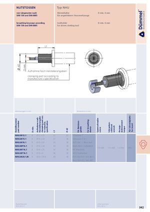 Bestellnummer d2part number D min. D min. Aufnahme nach Herstellerangabe clamping part acc. to manufac. specification L1 Ø d2 für Nutstoss- geräte for broaching device Spannschraube screw Schrauben- schlüssel wrench Anzugs- drehmoment torque für Schneidplatte for insert NUTSTOSSEN Typ NHU von Längsnuten nach Klemmhalter D min. 6 mm DIN 138 und DIN 6885 für angetriebene Stosswerkzeuge broaching keyways according toolholder D min. 6 mm DIN 138 und DIN 6885 for driven slotting tool L1 Aufnahme nach Herstellerangaben clamping part according to manufacture´s specification Abmessungen in mm dimensions in mm NHU.0012.1 6 Ø12 x 25 32 20 Schwarzer 1 NHU.0015.1 6 Ø15 x 33 37 18 Schwarzer 2 in 1 NHU.0016.1 6 Ø16 x 30 33 18 EWS Slot + Benz LinA NHU.MP16.1 6 Ø16 x 34 33 18 Mario Pinto Stoßeinheit 110.645 111.645 1.5 Nm NPU.∙∙∙ NHU.MT16.1 6 Ø16 x 25 33 18 MT Marchetti NHU.WT16.1 6 Ø16 x 6 36 18 WTO Stoßeinheit NHU.0020.1.IK 6 Ø20 x 39.5 34 18 EWS Slot P20 / incl. IKZ + Benz LinA 4.0 / incl. IKZ Bestellbeispiel: order-example: NHU.0012.1 NHU.0012.1 342