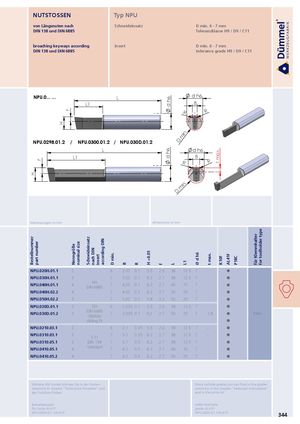 HBestellnummer part number f H f Nenngröße nominal size Schneideinsatz nach DIN insert according DIN D min. B R H +0.05 f d h6d h6 L D min.L1 Ø d h6 t max. t max.K10F AL41F P18C für Klemmhalter for toolholder type NUTSTOSSEN Typ NPU von Längsnuten nach Schneideinsatz D min. 6 - 7 mm DIN 138 und DIN 6885 Toleranzklasse H9 / D9 / C11 broaching keyways according insert D min. 6 - 7 mm DIN 138 und DIN 6885 tolerance grade H9 / D9 / C11 NPU.0... ... L d h6 L1 B R R NPU.0298.01.2 / NPU.0300.01.2 / NPU.030D.01.2 L d h6 L1 B R R D min. Abmessungen in mm dimensions in mm NPU.020H.01.1 2 6 2.02 0.1 5.5 2.0 38 12.5 7 - NPU.030H.01.1 3 7 3.02 0.1 6.2 2.7 38 12.5 7 - NPU.040H.01.1 4 H9DIN 6885 7 4.02 0.1 6.2 2.7 40 15 7 - NPU.040H.02.2 4 7 4.02 0.2 6.2 2.7 50 25 7 - NPU.050H.02.2 5 7 5.02 0.2 5.8 2.3 50 25 7 - NPU.020D.01.1 2 D9 6 2.035 0.1 5.5 2.0 38 12.5 7 - NPU.030D.01.2 3 DIN 6885Gleitsitz 7 3.035 0.1 6.2 2.7 50 25 7 1.8 NHU.∙∙∙ sliding fit NPU.0210.03.1 2 6 2.1 0.35 5.5 2.0 38 12.5 7 - NPU.0310.03.1 3 C11 7 3.1 0.35 6.2 2.7 38 12.5 7 - NPU.0310.05.1 3 DIN 138 7 3.1 0.5 6.2 2.7 38 12.5 7 - NPU.0410.05.1 4 Standard 7 4.1 0.5 6.2 2.7 40 15 7 - NPU.0410.05.2 4 7 4.1 0.5 6.2 2.7 50 25 7 - Weitere HM Sorten können Sie in der Sorten- More carbide grades you can find in the grades übersicht im Kapitel "Technische Hinweise" und summary in the chapter "technical instructions" der Preisliste finden. and in the price list. Bestellbeispiel: order-example: für Sorte AL41F: grade AL41F: NPU.020H.01.1/AL41F NPU.020H.01.1/AL41F 344