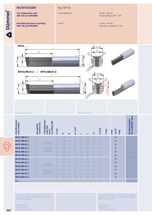HHBestellnummerpart number ff Nenngröße nominal size Schneideinsatz nach DIN insert according DIN D min. B R H +0.05 d h6d h6f L L1 Ø d h6 t max.t max. K10F AL41F P18C für Klemmhalter for toolholder type NUTSTOSSEN Typ NP10 von Längsnuten nach Schneideinsatz D min. 10 mm DIN 138 und DIN 6885 Toleranzklasse P9 / JS9 broaching keyways according insert D min. 10 mm DIN 138 und DIN 6885 tolerance grade P9 / JS9 NP10.... ... L d h6 L1 BR R NP10.298.01.2 / NP10.300.01.2 D min. L d h6 L1 R B R D min. Abmessungen in mm dimensions in mm NP10.298.01.2 3 10 2.98 0.1 9 4 50 25 10 1.8 NP10.398.02.2 4 P9 10 3.98 0.2 9 4 50 25 10 - NP10.398.02.3 4 DIN 6885 10 3.98 0.2 9 4 66 41 10 - NP10.498.02.2 5 fester Sitz 10 4.98 0.2 9 4 50 25 10 - NP10.498.02.3 5 strong fit 10 4.98 0.2 9 4 66 41 10 - NP10.598.02.3 6 10 5.98 0.2 8.5 3.5 66 41 10 - NH10.∙∙∙ NP10.300.01.2 3 10 3.0 0.1 9 4 50 25 10 1.8 NP10.400.02.2 4 JS9 10 4.0 0.2 9 4 50 25 10 - NP10.400.02.3 4 DIN 6885 10 4.0 0.2 9 4 66 41 10 - NP10.500.02.2 5 leichter Sitz 10 5.0 0.2 9 4 50 25 10 - NP10.500.02.3 5 slightly fit 10 5.0 0.2 9 4 66 41 10 - NP10.600.02.3 6 10 6.0 0.2 8.5 3.5 66 41 10 - ↳ ... Weitere HM Sorten können Sie in der Sorten- More carbide grades you can find in the grades übersicht im Kapitel "Technische Hinweise" und summary in the chapter "technical instructions" der Preisliste finden. and in the price list. Bestellbeispiel: order-example: für Sorte AL41F: grade AL41F: 347 NP10.298.01.2/AL41F NP10.298.01.2/AL41F