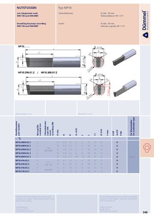 HHBestellnummerpart number ff Nenngröße nominal size Schneideinsatz nach DIN insert according DIN D min. B R H +0.05 d h6d h6f L L1 Ø d h6 t max.t max. K10F AL41F P18C für Klemmhalter for toolholder type NUTSTOSSEN Typ NP10 von Längsnuten nach Schneideinsatz D min. 10 mm DIN 138 und DIN 6885 Toleranzklasse H9 / C11 broaching keyways according insert D min. 10 mm DIN 138 und DIN 6885 tolerance grade H9 / C11 NP10.... ... L d h6 L1 BR R NP10.298.01.2 / NP10.300.01.2 D min. L d h6 L1 R B R D min. Abmessungen in mm dimensions in mm ... ↴ NP10.040H.02.2 4 10 4.02 0.2 9 4 50 25 10 - NP10.040H.02.3 4 10 4.02 0.2 9 4 66 41 10 - NP10.050H.02.2 5 H9DIN 6885 10 5.02 0.2 9 4 50 25 10 - NP10.050H.02.3 5 10 5.02 0.2 9 4 66 41 10 - NP10.060H.02.3 6 10 6.02 0.2 8.5 3.5 66 41 10 - NH10.∙∙∙ NP10.410.05.2 4 10 4.1 0.5 9 4 50 25 10 - C11 NP10.410.05.3 4 DIN 138 10 4.1 0.5 9 4 66 41 10 - NP10.510.05.2 5 10 5.1 0.5 9 4 50 25 10 - NP10.510.05.3 Standard5 10 5.1 0.5 9 4 66 41 10 - Weitere HM Sorten können Sie in der Sorten- More carbide grades you can find in the grades übersicht im Kapitel "Technische Hinweise" und summary in the chapter "technical instructions" der Preisliste finden. and in the price list. Bestellbeispiel: order-example: für Sorte AL41F: grade AL41F: NP10.040H.02.2/AL41F NP10.040H.02.2/AL41F 348