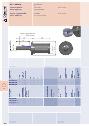 D min.BestellnummerBestellnummerpart numberpart number f D min.D min. Ø d g6 x L3Aufnahme nach AufnahmeHerstellerangabe clamping partclamping part acc. to manufac. specification L1 L2 f Ø d1 für Nutstossgeräte dg6for broachingdevice d1 SpannschraubeSpannschraube screwscrew SchraubenschlüsselSchraubenschlüssel wrenchwrench Anzugs-Anzugs- drehmomentdrehmoment torquetorque für Schneidplattefür Schneidplatte for insertfor insert NUTSTOSSEN Typ NHV.10 von Längsnuten nach Klemmhalter D min. 10 mm DIN 138 und DIN 6885 mit Innenkühlung broaching keyways according toolholder D min. 10 mm DIN 138 und DIN 6885 with internal cooling innere Kühlmittelzufuhr through coolant L1 L3 L2 Abmessungen in mm dimensions in mm NHV.10.IK25.1 10 Ø25 x 40 30 22 4.9 33 NHV.10.IK25.2 10 Ø25 x 40 40 32 4.9 33 M2-NH10 T6F 1.2 Nm NV10.∙∙∙ NHV.10.IK25.3 10 Ø25 x 40 50 42 4.9 33 NHV.10.0016.1 10 Ø16 x 30 46 36 EWS Slot + Benz LinA NHV.10.WT16.1 10 Ø16 x 6 49 35 WTO Stoßeinheit M2-NH10 T6F 1.2 Nm NV10.∙∙∙ NHV.10.0020.1.IK 10 Ø20 x 39.5 46 36 EWS Slot P20 / incl. IKZ + Benz LinA 4.0 / incl. IKZ Bestellbeispiel: order-example: 349 NHV.10.IK25.1 NHV.10.IK25.1