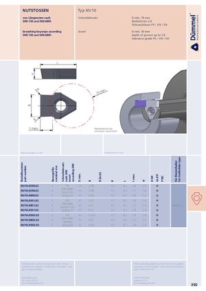 Bestellnummer part number B H Nenngröße nominal size Schneideinsatz nach DIN insert according DIN D min. B B (inch) R L t max. H K10F AL41F P18C für Klemmhalter for toolholder type NUTSTOSSEN Typ NV10 von Längsnuten nach Schneideinsatz D min. 10 mm DIN 138 und DIN 6885 Nuttiefe bis 2.8 Toleranzklasse P9 / JS9 / D9 broaching keyways according insert D min. 10 mm DIN 138 und DIN 6885 depth of groove up to 2.8 tolerance grade P9 / JS9 / D9 L R D min. R t max Beispielzeichnung exemplary application Abmessungen in mm dimensions in mm NV10.0298.02 3 P9 10 2.98 0.2 8.2 1.8 2.4 NV10.0398.02 4 DIN 6885fester Sitz 10 3.98 0.2 8.2 2.3 2.4 NV10.0498.02 5 strong fit 10 4.98 0.2 8.2 2.8 2.4 NV10.0301.02 3 JS9 10 3.01 0.2 8.2 1.8 2.4 NV10.0401.02 4 DIN 6885leichter Sitz 10 4.01 0.2 8.2 2.3 2.4 NHV.10.∙∙∙ NV10.0501.02 5 slightly fit 10 5.01 0.2 8.2 2.8 2.4 NV10.030D.02 3 D9 10 3.035 0.2 8.2 1.8 2.4 NV10.040D.02 4 DIN 6885Gleitsitz 10 4.05 0.2 8.2 2.3 2.4 NV10.050D.02 5 sliding fit 10 5.05 0.2 8.2 2.8 2.4 Weitere HM Sorten können Sie in der Sorten- More carbide grades you can find in the grades übersicht im Kapitel "Technische Hinweise" und summary in the chapter "technical instructions" der Preisliste finden. and in the price list. Bestellbeispiel: order-example: für Sorte AL41F: grade AL41F: NV10.0298.02/AL41F NV10.0298.02/AL41F 350
