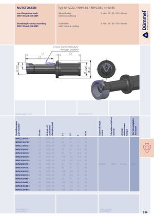 D min.Bestellnummerpart number f D min. Ø d g6 x L3 Aufnahme clamping part L1 L2 f dg6Ø d1 d1 Spannschraube screw Schraubenschlüssel wrench Anzugs- drehmoment torque für Schneidplatte for insert NUTSTOSSEN Typ NHV.22 / NHV.30 / NHV.38 / NHV.45 von Längsnuten nach Klemmhalter D min. 22 / 30 / 38 / 45 mm DIN 138 und DIN 6885 mit Innenkühlung broaching keyways according toolholder D min. 22 / 30 / 38 / 45 mm DIN 138 und DIN 6885 with internal cooling innere Kühlmittelzufuhr through coolant L1 L3 L2 Abmessungen in mm dimensions in mm NHV.22.0025.1 22 Ø25 x 40 60 50 12 33 NHV.22.0025.2 22 Ø25 x 40 85 75 12 33 NHV.22.0025.3 22 Ø25 x 60 115 105 12 33 NHV.30.0032.1 30 Ø32 x 40 60 50 16.5 45 NHV.30.0032.2 30 Ø32 x 40 85 75 16.5 45 NHV.30.0032.3 30 Ø32 x 40 115 105 16.5 45 NHV.30.0032.4 30 Ø32 x 60 160 150 16.5 45 NHV.38.0032.1 38 Ø32 x 40 60 50 22 45 85.818 TR20 6.0 Nm NPV.∙∙∙ NHV.38.0032.2 38 Ø32 x 40 85 75 22 45 NHV.38.0032.3 38 Ø32 x 40 115 105 22 45 NHV.38.0032.4 38 Ø32 x 60 175 165 22 45 NHV.45.0040.1 45 Ø40 x 60 60 50 24 55 NHV.45.0040.3 45 Ø40 x 60 115 105 24 55 NHV.45.0040.4 45 Ø40 x 60 165 155 24 55 NHV.45.0040.5 45 Ø40 x 60 215 205 24 55 Bestellbeispiel: order-example: NHV.22.0025.1 NHV.22.0025.1 354