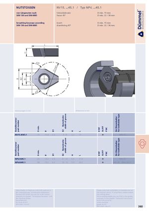 BestellnummerBestellnummer B part numberpart number B2 HB1 D min.D min. BB D min.B1B1 NutenbreiteB2NutenbreiteB2 width of groovewidth of groove HH LL K10FK10F AL41FAL41F P18CP18C für Klemmhalterfür Klemmhalter for toolholder typefor toolholder type NUTSTOSSEN NV15. ...45.1 / Typ NPV. ...45.1 von Längsnuten nach Schneideinsatz D min. 15 mm DIN 138 und DIN 6885 Fasen 45° D min. 22 / 38 mm broaching keyways according insert D min. 15 mm DIN 138 und DIN 6885 chamfering 45° D min. 22 / 38 mm L 45° 45° Abmessungen in mm dimensions in mm NV15.4545.1 15 10.4 2.5 5-8 3.2 13 NHV.15.∙∙∙ NPV.3045.1 22 13.2 3.5 6 - 10 5.3 17.3 NHV.22.∙∙∙ NPV.6045.1 38 13.2 6.0 10 - 12 5.3 20.2 NHV.38.∙∙∙(NHV.30/22.∙∙∙) Klemmhalter in Klammer sind nicht optimal in Please note that toolholders in brackets are not der Unterstützung. Schnittwerte reduzieren! the optimal choice. If using them, please reduce Weitere HM Sorten können Sie in der Sorten- the cutting data! übersicht im Kapitel "Technische Hinweise" und More carbide grades you can find in the grades der Preisliste finden. summary in the chapter "technical instructions" Bestellbeispiel: and in the price list. für Sorte AL41F: order-example: NPV.3045.1/AL41F grade AL41F: NPV.3045.1/AL41F 360