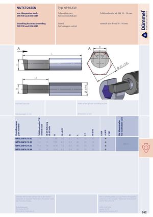 HBBestellnummerpart number Schlüsselweite SW wrench size Ø d1 Bohrung Ø d1 hole B H +0.05 R L d h6L1 Ø d h6 RK10F AL41F P18C für Klemmhalter for toolholder type R NUTSTOSSEN Typ NP10.SW von Längsnuten nach Schneideinsatz Schlüsselweite ab SW 10 - 16 mm DIN 138 und DIN 6885 für Innensechskant broaching keyways according insert wrench size from 10 - 16 mm DIN 138 und DIN 6885 for hexagon socket A A B L d1 / SW L1 Nutmaß nach DIN width of the groove according to DIN Abmessungen in mm dimensions in mm NP10.SW10.10.02 10 10 5.85 9.0 0.2 40 15 10 NP10.SW12.12.03 12 12 7.02 8.2 0.3 45 20 10 NH10.∙∙∙ NP10.SW14.14.03 14 14 8.18 7.5 0.3 45 20 10 NP10.SW16.16.04 16 16 9.34 6.2 0.4 50 25 10 Weitere HM Sorten können Sie in der Sorten- More carbide grades you can find in the grades übersicht im Kapitel "Technische Hinweise" und summary in the chapter "technical instructions" der Preisliste finden. and in the price list. Bestellbeispiel: order-example: für Sorte AL41F: grade AL41F: NPU.SW10.10.02/AL41F NPU.SW10.10.02/AL41F 362