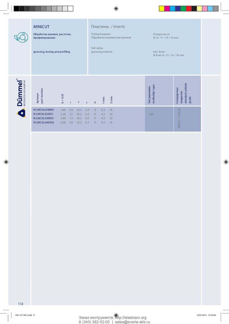MINICUT Пластины / inserts Обработка канавок, расточка, Полный радиус Отверстие от профилирование Обработка канавок внутренняя Ø 8 / 11 / 14 / 16 mm full radius grooving, boring and profiling grooving internal m i n . b o r e Ø from 8 / 11 / 14 / 16 mm Артикул part number r f s d b + 0.05 t max. D min. Тип державки toolholder type Стандартное покрытие standard carbide grade R/LMC16.018R09 1.80 0.9 10.2 5.4 11 4.3 16 R/LMC16.022R11 2.20 1.1 10.2 5.4 11 4.3 16 616 R/LMC16.030R15 3.00 1.5 10.2 5.4 11 4.3 16 R/LMC16.040R20 4.00 2.0 10.2 5.4 11 4.3 16 DW41L (=TIALN) 114 108-123-MC.indd 8 108-123-MC.indd 8 12.03.2014 15:20:46 12.03.2014 15:20:46 Заказ инструмента: http://steelcam.org 8 (343) 382-52-03 | sales@sverla-ekb.ru