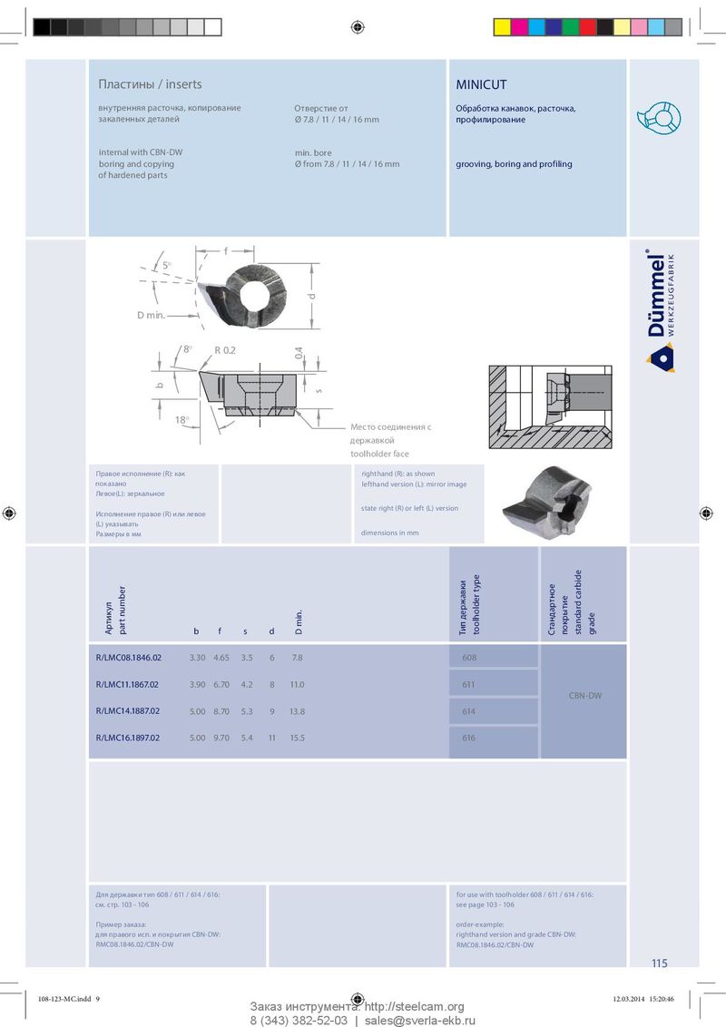 Пластины / inserts MINICUT внутренняя расточка, копирование Отверстие от Обработка канавок, расточка, закаленных деталей Ø 7.8 / 11 / 14 / 16 mm профилирование internal with CBN-DW min. bore boring and copying Ø from 7.8 / 11 / 14 / 16 mm grooving, boring and profiling of hardened parts f 5° d D min. 8° R 0.2 0.4 b s 18° Место соединения с Klemmhalter Stirnseite державкой toolholder face toolholder face Правое исполнение (R): как righthand (R): as shown показано lefthand version (L): mirror image Левое(L): зеркальное state right (R) or left (L) version Исполнение правое (R) или левое (L) указывать Размеры в мм dimensions in mm Артикул part number b f s d D min. Тип державки toolholder type Стандартное покрытие standard carbide grade R/LMC08.1846.02 3.30 4.65 3.5 6 7.8 608 R/LMC11.1867.02 3.90 6.70 4.2 8 11.0 611 CBN-DW R/LMC14.1887.02 5.00 8.70 5.3 9 13.8 614 R/LMC16.1897.02 5.00 9.70 5.4 11 15.5 616 Для державки тип 608 / 611 / 614 / 616: for use with toolholder 608 / 611 / 614 / 616: см. стр. 103 - 106 see page 103 - 106 Пример заказа: order-example: для правого исп. и покрытия CBN-DW: righthand version and grade CBN-DW: RMC08.1846.02/CBN-DW RMC08.1846.02/CBN-DW 115 108-123-MC.indd 9 108-123-MC.indd 9 12.03.2014 15:20:46 12.03.2014 15:20:46 Заказ инструмента: http://steelcam.org 8 (343) 382-52-03 | sales@sverla-ekb.ru