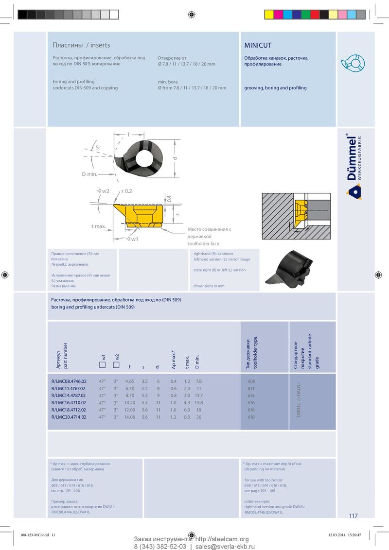 Пластины / inserts MINICUT Расточка, профилирование, обработка под Отверстие от Обработка канавок, расточка, выход по DIN 509, копирование Ø 7.8 / 11 / 13.7 / 18 / 20 mm профилирование boring and profiling m i n . b o r e undercuts DIN 509 and copying Ø from 7.8 / 11 / 13.7 / 18 / 20 mm grooving, boring and profiling f 5° d D min. լw2 r 0.2 0.4 s t max. Место соединения с Klemmhalter Stirnseite державкой լw1 toolholder face toolholder face Правое исполнение (R): как righthand (R): as shown показано lefthand version (L): mirror image Левое(L): зеркальное state right (R) or left (L) version Исполнение правое (R) или левое (L) указывать Размеры в мм dimensions in mm Расточка, профилирование, обработка под вход по (DIN 509) boring and profiling undercuts (DIN 509) w1 w2 Артикул part number f s d Ap max.* t max. D min. Тип державки toolholder type Стандартное покрытие standard carbide grade R/LMC08.4746.02 47° 3° 4 . 65 3.5 6 0.4 1.2 7.8 608 R/LMC11.4767.02 47° 3° 6.70 4.2 8 0.6 2.3 11 611 R/LMC14.4787.02 47° 3° 8.70 5.3 9 0.8 3.0 13.7 614 R/LMC16.4710.02 47° 3° 10.20 5.4 11 1.0 4.3 15.8 616 R/LMC18.4712.02 47° 3° 12.00 5.6 11 1.0 6.0 18 618 R/LMC20.4714.02 47° 3° 14.00 5.6 11 1.2 8.0 20 618 DW41L (=TIALN) * Ap max. = макс. глубина резания * Ap. max = maximum depht of cut (зависит от обраб. материала) (depending on material) Для державки тип for use with toolholder 608 / 611 / 614 / 616 / 618: 608 / 611 / 614 / 616 / 618: см. стр. 103 - 106 see page 103 - 106 Пример заказа: order-example: для правого исп. и покрытия DW41L: righthand version and grade DW41L: RMC08.4746.02/DW41L RMC08.4746.02/DW41L 117 108-123-MC.indd 11 108-123-MC.indd 11 12.03.2014 15:20:47 12.03.2014 15:20:47 Заказ инструмента: http://steelcam.org 8 (343) 382-52-03 | sales@sverla-ekb.ru