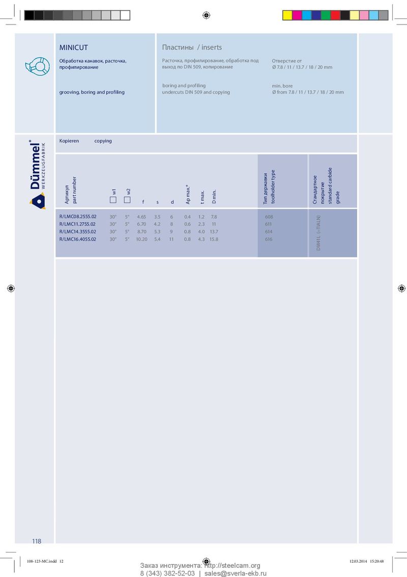 MINICUT Пластины / inserts Обработка канавок, расточка, Расточка, профилирование, обработка под Отверстие от профилирование выход по DIN 509, копирование Ø 7.8 / 11 / 13.7 / 18 / 20 mm boring and profiling m i n . b o r e grooving, boring and profiling undercuts DIN 509 and copying Ø from 7.8 / 11 / 13.7 / 18 / 20 mm Kopieren copying w1 w2 Артикул part number f s d Ap max.* t max. D min. Тип державки toolholder type Стандартное покрытие standard carbide grade R/LMC08.2555.02 30° 5° 4 . 65 3.5 6 0.4 1.2 7.8 608 R/LMC11.2755.02 30° 5° 6.70 4.2 8 0.6 2.3 11 611 R/LMC14.3555.02 30° 5° 8.70 5.3 9 0.8 4.0 13.7 614 R/LMC16.4055.02 30° 5° 10.20 5.4 11 0.8 4.3 15.8 616 DW41L (=TIALN) 118 108-123-MC.indd 12 108-123-MC.indd 12 12.03.2014 15:20:48 12.03.2014 15:20:48 Заказ инструмента: http://steelcam.org 8 (343) 382-52-03 | sales@sverla-ekb.ru