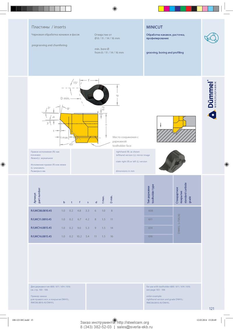 Пластины / inserts MINICUT Черновая обработка канавок и фасок Отверстие от Обработка канавок, расточка, Ø 8 / 11 / 14 / 16 mm профилирование pregrooving and chamfering m i n . b o r e Ø from 8 / 11 / 14 / 16 mm grooving, boring and profiling f 15° d D min. 3° 8° 0.2 b 3° s t t max. Место соединения с Klemmhalter Stirnseite державкой 45° toolholder face toolholder face Правое исполнение (R): как righthand (R): as shown показано lefthand version (L): mirror image Левое(L): зеркальное state right (R) or left (L) version Исполнение правое (R) или левое (L) указывать Размеры в мм dimensions in mm Артикул part number b t f s d t max. D min. Тип державки toolholder type Стандартное покрытие standard carbide grade R/LMC08.0810.45 1.0 0.2 4.8 3.3 6 1.0 8 608 R/LMC11.0810.45 1.0 0.2 6.7 4.2 8 1.5 11 611 R/LMC14.0815.45 1.0 0.2 9.0 5.3 9 1.5 14 614 DW41L (=TIALN) R/LMC16.0815.45 1.0 0.2 10.2 5.4 11 1.5 16 616 Для державки тип 608 / 611 / 614 / 616: for use with toolholder 608 / 611 / 614 / 616: см. стр. 103 - 106 see page 103 - 106 Пример заказа: order-example: для правого исп. и покрытия DW41L: righthand version and grade DW41L: RMC08.0810.45/DW41L RMC08.0810.45/DW41L 121 108-123-MC.indd 15 108-123-MC.indd 15 12.03.2014 15:20:49 12.03.2014 15:20:49 Заказ инструмента: http://steelcam.org 8 (343) 382-52-03 | sales@sverla-ekb.ru
