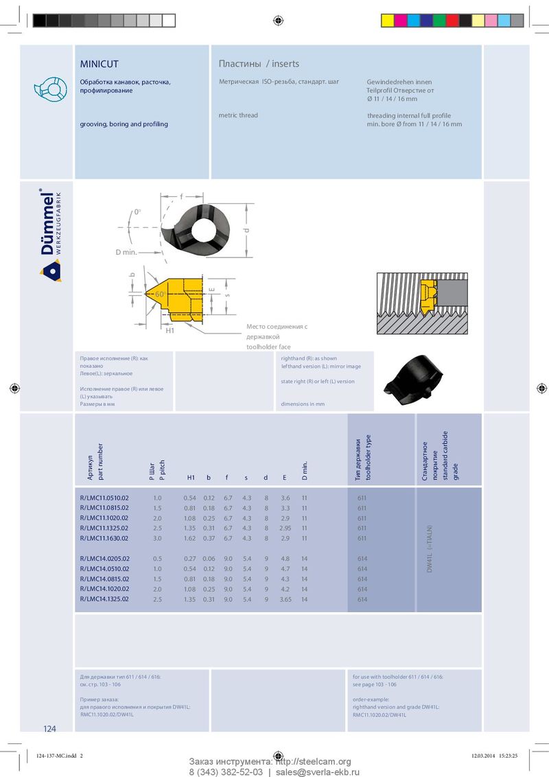 MINICUT Пластины / inserts Обработка канавок, расточка, Метрическая ISO-резьба, стандарт. шаг Gewindedrehen innen профилирование Teilprofil Отверстие от Ø 11 / 14 / 16 mm metric thread threading internal full profile grooving, boring and profiling min. bore Ø from 11 / 14 / 16 mm f 0° d D min. b E 60° s Klemmhalter Stirnseite Место соединения с H1 toolholder face державкой toolholder face Правое исполнение (R): как righthand (R): as shown показано lefthand version (L): mirror image Левое(L): зеркальное state right (R) or left (L) version Исполнение правое (R) или левое (L) указывать Размеры в мм dimensions in mm Артикул part number H1 b f s d E P Шаг P pitch D min. Тип державки toolholder type Стандартное покрытие standard carbide grade R/LMC11.0510.02 1. 0 0.54 0 .12 6 . 7 4.3 8 3.6 11 611 R/LMC11.0815.02 1.5 0.81 0.18 6.7 4.3 8 3.3 11 611 R/LMC11.1020.02 2.0 1.08 0.25 6.7 4.3 8 2 .9 11 611 R/LMC11.1325.02 2.5 1.35 0.31 6.7 4.3 8 2.95 11 611 R/LMC11.1630.02 3.0 1.62 0.37 6.7 4.3 8 2.9 11 611 R/LMC14.0205.02 0.5 0.27 0.06 9. 0 5.4 9 4.8 14 614 R/LMC14.0510.02 1.0 0.54 0.12 9.0 5.4 9 4.7 14 614 DW41L (=TIALN) R/LMC14.0815.02 1.5 0.81 0.18 9.0 5.4 9 4.3 14 614 R/LMC14.1020.02 2.0 1.08 0.25 9.0 5.4 9 4.2 14 614 R/LMC14.1325.02 2.5 1.35 0.31 9.0 5.4 9 3.65 14 614 Для державки тип 611 / 614 / 616: for use with toolholder 611 / 614 / 616: см. стр. 103 - 106 see page 103 - 106 Пример заказа: order-example: для правого исполнения и покрытия DW41L: righthand version and grade DW41L: RMC11.1020.02/DW41L RMC11.1020.02/DW41L 124 124-137-MC.indd 2 124-137-MC.indd 2 12.03.2014 15:23:25 12.03.2014 15:23:25 Заказ инструмента: http://steelcam.org 8 (343) 382-52-03 | sales@sverla-ekb.ru
