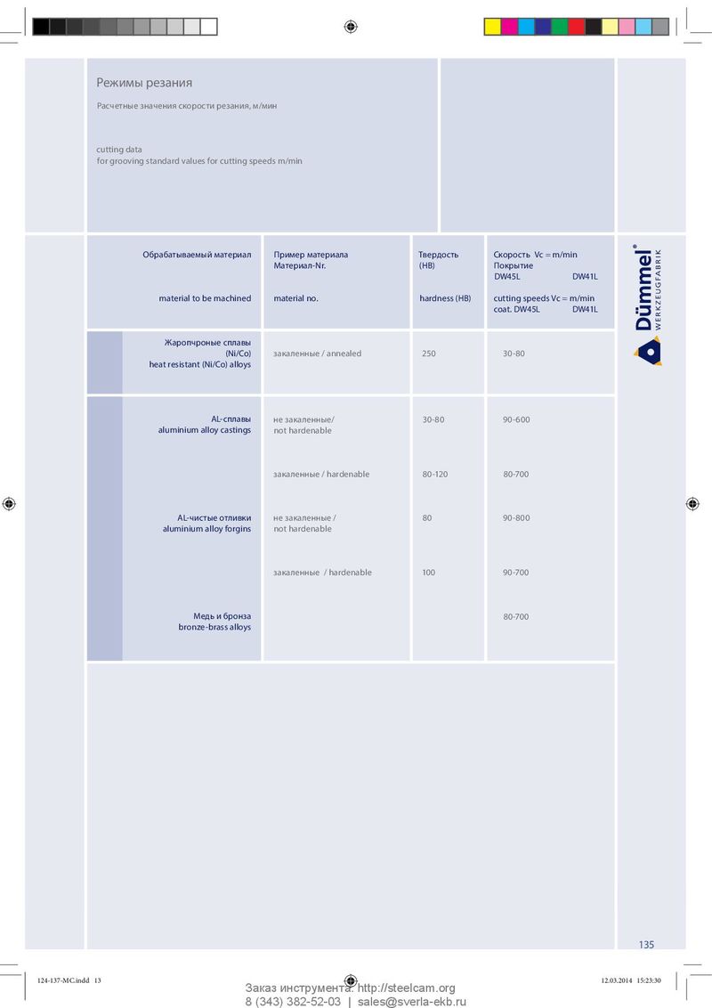 Режимы резания Расчетные значения скорости резания, м/мин cutting data for grooving standard values for cutting speeds m/min Обрабатываемый материал Пример материала Твердость Скорость Vc = m/min Материал-Nr. (HB) Покрытие DW45L DW41L material to be machined material no. hardness (HB) cutting speeds Vc = m/min coat. DW45L DW41L Жаропчроные сплавы (Ni/Co) закаленные / annealed 250 30-80 heat resistant (Ni/Co) alloys AL-сплавы не закаленные/ 30-80 90-600 aluminium alloy castings not hardenable закаленные / hardenable 80-120 80-700 AL-чистые отливки не закаленные / 80 90-800 aluminium alloy forgins not hardenable закаленные / hardenable 100 90-700 Медь и бронза 80-700 bronze-brass alloys 135 124-137-MC.indd 13 124-137-MC.indd 13 12.03.2014 15:23:30 12.03.2014 15:23:30 Заказ инструмента: http://steelcam.org 8 (343) 382-52-03 | sales@sverla-ekb.ru