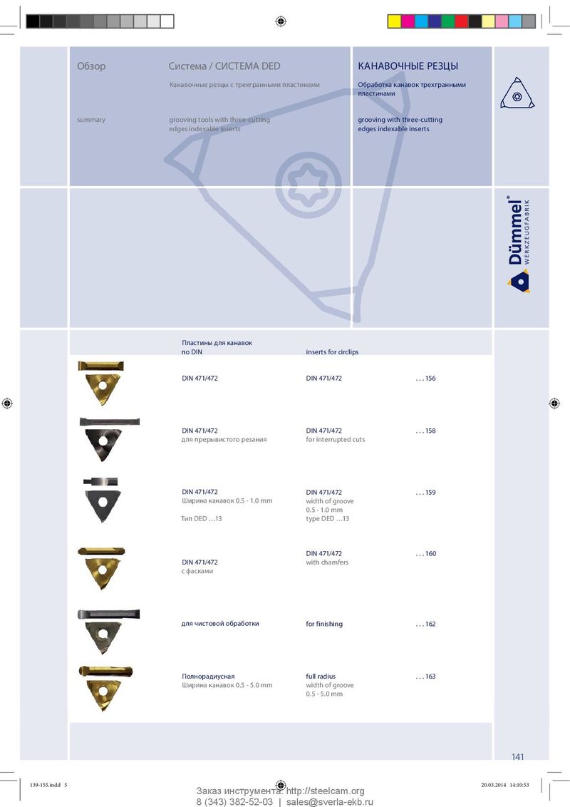Обзор Система / СИСТЕМА DED КАНАВОЧНЫЕ РЕЗЦЫ Канавочные резцы с трехгранными пластинами Обработка канавок трехгранными пластинами summary grooving tools with three-cutting grooving with three-cutting edges indexable inserts edges indexable inserts Пластины для канавок по DIN inserts for circlips DIN 471/472 DIN 471/472 . . . 156 DIN 471/472 DIN 471/472 . . . 158 для прерывистого резания for interrupted cuts DIN 471/472 DIN 471/472 . . . 159 Ширина канавок 0.5 - 1.0 mm width of groove 0.5 - 1.0 mm Тип DED …13 type DED …13 DIN 471/472 . . . 160 DIN 471/472 with chamfers с фасками для чистовой обработки for finishing . . . 162 Полнорадиусная full radius . . . 163 Ширина канавок 0.5 - 5.0 mm width of groove 0.5 - 5.0 mm 141 139-155.indd 5 139-155.indd 5 20.03.2014 14:10:53 20.03.2014 14:10:53 Заказ инструмента: http://steelcam.org 8 (343) 382-52-03 | sales@sverla-ekb.ru