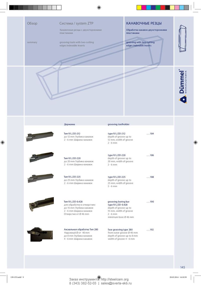 Обзор Система / system ZTP КАНАВОЧНЫЕ РЕЗЦЫ Канавочные резцы с двухсторонними Обработка канавок двухсторонними пластинами пластинами summary grooving tools with two-cutting grooving with two-cutting edges indexable inserts edges indexable inserts Державка grooving toolholder Тип R/L.DD-212 type R/L.DD-212 . . . 184 до 12 mm Глубина канавок depth of groove up to 2 - 6 mm Ширина канавок 12 mm, width of groove 2 - 6 mm type R/L.DD-220 . . . 186 Тип R/L.DD-220 depth of groove up to до 20 mm Глубина канавок 20 mm, width of groove 2 - 6 mm Ширина канавок 2 - 6 mm Тип R/L.DD-225 type R/L.DD-225 . . . 188 до 25 mm Глубина канавок depth of groove up to 2 - 6 mm Ширина канавок 25 mm, width of groove 2 - 6 mm Тип R/L.DD-0.428 grooving boring bar . . . 190 для обработки в отверстиях type R/L.DD-0.428 до 15 mm Глубина канавок depth of groove up to 2 - 6 mm Ширина канавок 15 mm, width of groove Отверстие от Ø 46 mm 2 - 6 mm minimum bore Ø 46 mm Аксиальная обработка Тип 280 face grooving type 280 . . . 192 Наружный Ø от 40 mm from outer groove Ø 40 mm до 8 mm Глубина канавок depth of groove up to 8 mm 4 - 6 mm Ширина канавок width of groove 4 - 6 mm 145 139-155.indd 9 139-155.indd 9 20.03.2014 14:10:59 20.03.2014 14:10:59 Заказ инструмента: http://steelcam.org 8 (343) 382-52-03 | sales@sverla-ekb.ru