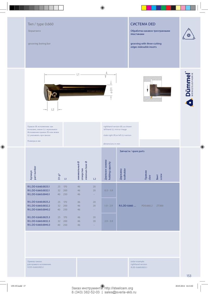 Тип / type 0.660 СИСТЕМА DED Борштанга Обработка канавок трехгранными пластинами grooving boring bar grooving with three-cutting edges indexable inserts L1 ø D1 L2 Правое (R) исполнение: как righthand version (R): as shown показано, левое (L): зеркальное lefthand (L): mirror image Исполнение правое (R) или левое (L) указывать при заказе state right (R) or left (L) version Размеры в мм dimensions in mm Запчасти / spare parts Артикул part number L1 L2 D1 g7 минимальный Ø отверстия minimum bore Ø Диапазон зажима holding capacity Державка toolholder Прижим claw Винт screw R / L . D D - 0 . 6 6 0 . 0 02 5 .1 25 170 46 20 R/L.DD-0.660.0032.1 32 200 46 20 0.5 - 1.9 R/L.DD-0.660.0040.1 40 250 46 – R / L . D D - 0 . 6 6 0 . 0 02 5 . 2 25 170 46 20 R/L.DD-0.660.0032.2 32 200 46 20 1.9 - 2.9 R/L.DD-0.660 … PD0.660.2 ZT300 R/L.DD-0.660.0040.2 40 250 46 – R / L . D D - 0 . 6 6 0 . 0 02 5 . 3 25 170 46 20 R/L.DD-0.660.0032.3 32 200 46 20 2.9 - 3.9 R/L.DD-0.660.0040.3 40 250 46 – Пример заказа: order-example: для правого исполнения: righthand version: R.DD-0.660.0025.1 R.DD-0.660.0025.1 153 139-155.indd 17 139-155.indd 17 20.03.2014 14:11:02 20.03.2014 14:11:02 Заказ инструмента: http://steelcam.org 8 (343) 382-52-03 | sales@sverla-ekb.ru