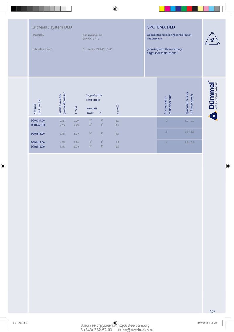 Система / system DED СИСТЕМА DED Пластины для канавок по Обработка канавок трехгранными DIN 471 / 472 пластинами indexable insert for circlips DIN 471 / 472 grooving with three-cutting edges indexable inserts Задний угол clear angel capacity Нижний Артикул part number Размер канавки groove dimension S - 0.05 lower α a ± 0.02 Тип державки toolholder type Диапазон зажима holding DD.0215.00 2.15 2.29 3 ° 3 ° 0.2 2 1.9 - 2.9 DD.0265.00 2.65 2.79 3 ° 3 ° 0.2 .3 2.9 - 3.9 DD.0315.00 3.15 3.29 3 ° 3 ° 0.2 DD.0415.00 4.15 4.29 3 ° 3 ° 0.2 .4 3.9 - 6.3 DD.0515.00 5.15 5.29 3 ° 3 ° 0.2 157 156-169.indd 3 156-169.indd 3 20.03.2014 14:14:44 20.03.2014 14:14:44 Заказ инструмента: http://steelcam.org 8 (343) 382-52-03 | sales@sverla-ekb.ru