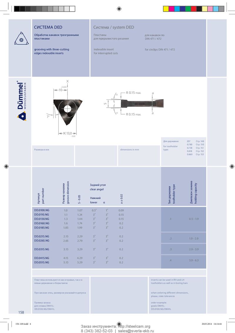 СИСТЕМА DED Система / system DED Обработка канавок трехгранными Пластины для канавок по пластинами для прерывистого резания DIN 471 / 472 grooving with three-cutting indexable insert for circlips DIN 471 / 472 edges indexable inserts for interrupted cuts X ± 0.035 10 R 0.15 max. α a S α a R 0.15 max. 7° IK 13,0 - 0.03 Для державки: 207 Стр. 148 0.780 Стр. 150 for toolholder 0.738 Стр. 151 Размеры в мм dimensions in mm type: 0.618 Стр. 152 0.660 Стр. 153 Задний угол clear angel capacity Нижний Артикул part number Размер канавки groove dimension S - 0.05 lower α a ± 0.02 Тип державки toolholder type Диапазон зажима holding DD.0100.NG 1.0 1.07 0.5 ° 1 ° 0.09 DD.0110.NG 1.1 1.24 3 ° 3 ° 0.15 DD.0130.NG 1.3 1.44 3 ° 3 ° 0.15 .1 0.5 - 1.9 DD.0160.NG 1.6 1.74 3 ° 3 ° 0.2 DD.0185.NG 1.85 1.99 3 ° 3 ° 0.2 DD.0215.NG 2.15 2.29 3 ° 3 ° 0.2 .2 1.9 - 2.9 DD.0265.NG 2.65 2.79 3 ° 3 ° 0.2 DD.0315.NG 3.15 3.29 3 ° 3 ° 0.2 .3 2.9 - 3.9 DD.0415.NG 4.15 4.29 3 ° 3 ° 0.2 .4 3.9 - 6.3 DD.0515.NG 5.15 5.29 3 ° 3 ° 0.2 Пластины используются как в правых, так и в inserts can be used in RH and LH левых державках и борштангах toolholders as well as in boring bars При заказах спец. размеров указывайте допуска when ordering different dimensions, please, state tolerances Пример заказа: order-example: для сплава DW41L: grade DW41L: DD.0100.NG/DW41L DD.0100.NG/DW41L 158 156-169.indd 4 156-169.indd 4 20.03.2014 14:14:44 20.03.2014 14:14:44 Заказ инструмента: http://steelcam.org 8 (343) 382-52-03 | sales@sverla-ekb.ru