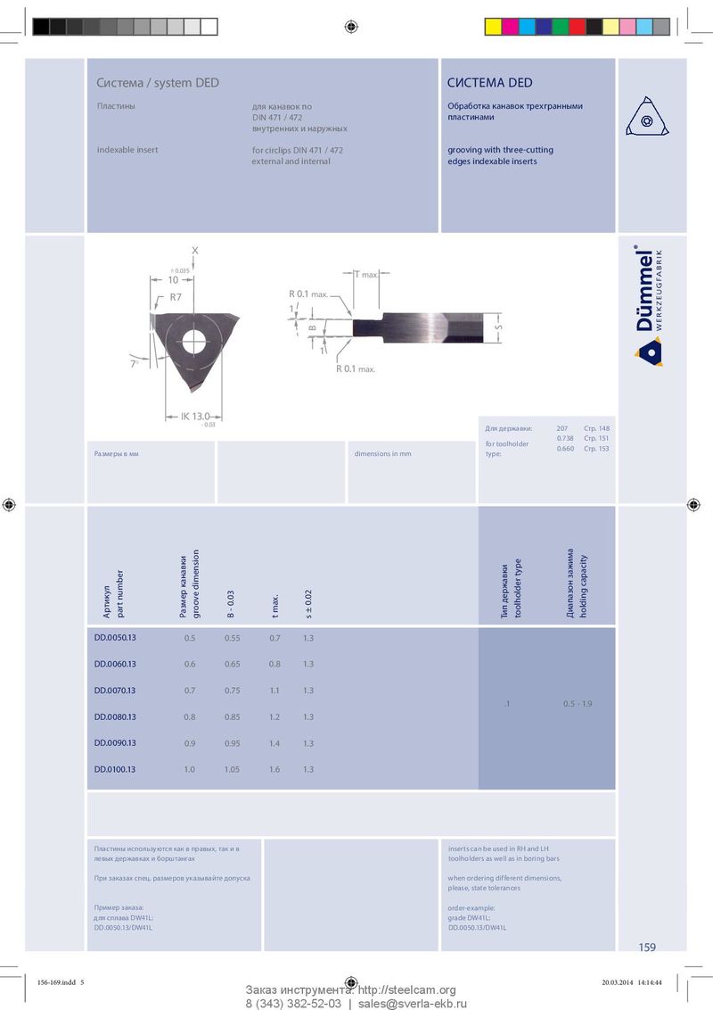 Система / system DED СИСТЕМА DED Пластины для канавок по Обработка канавок трехгранными DIN 471 / 472 пластинами внутренних и наружных indexable insert for circlips DIN 471 / 472 grooving with three-cutting external and internal edges indexable inserts X ± 0.035 T max. 10 R7 R 0.1 max. 1 B S 1 7° R 0.1 max. IK 13.0 - 0.03 Для державки: 207 Стр. 148 0.738 Стр. 151 for toolholder 0.660 Стр. 153 Размеры в мм dimensions in mm type: capacity Артикул part number Размер канавки groove dimension B - 0.03 t max. s ± 0.02 Тип державки toolholder type Диапазон зажима holding D D. 0 0 5 0 .13 0.5 0.55 0.7 1.3 DD.0060.13 0.6 0.65 0.8 1.3 DD.0070.13 0.7 0.75 1.1 1.3 .1 0.5 - 1.9 DD.0080.13 0.8 0.85 1.2 1.3 DD.0090.13 0.9 0.95 1.4 1.3 DD.0100.13 1.0 1.05 1.6 1.3 Пластины используются как в правых, так и в inserts can be used in RH and LH левых державках и борштангах toolholders as well as in boring bars При заказах спец. размеров указывайте допуска when ordering different dimensions, please, state tolerances Пример заказа: order-example: для сплава DW41L: grade DW41L: DD.0050.13/DW41L DD.0050.13/DW41L 159 156-169.indd 5 156-169.indd 5 20.03.2014 14:14:44 20.03.2014 14:14:44 Заказ инструмента: http://steelcam.org 8 (343) 382-52-03 | sales@sverla-ekb.ru