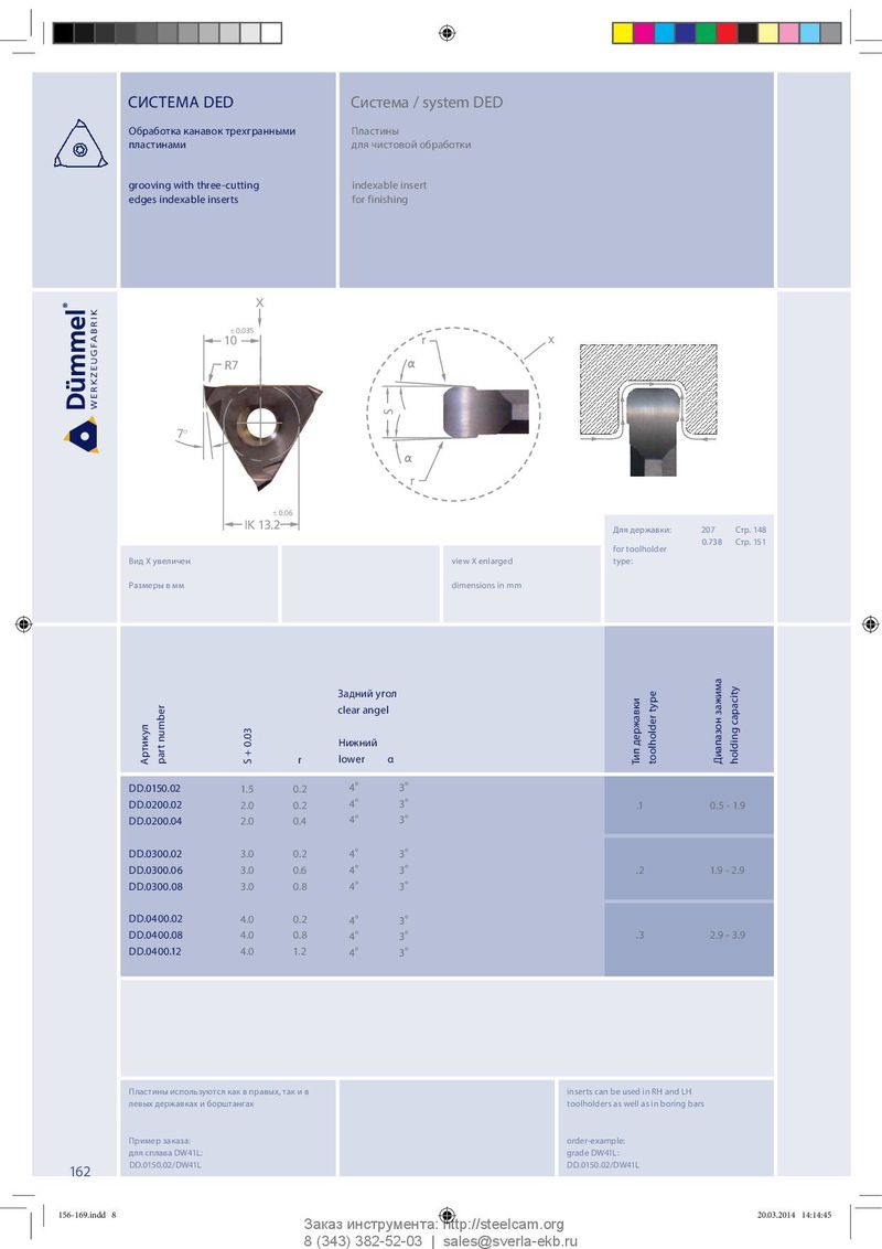СИСТЕМА DED Система / system DED Обработка канавок трехгранными Пластины пластинами для чистовой обработки grooving with three-cutting indexable insert edges indexable inserts for finishing X ± 0.035 10 r x R7 S 7° r ± 0.06 IK 13.2 Для державки: 207 Стр. 148 0.738 Стр. 151 for toolholder Вид Х увеличен view X enlarged type: Размеры в мм dimensions in mm Задний угол clear angel capacity Нижний Артикул part number r S + 0.03 lower α Тип державки toolholder type Диапазон зажима holding DD.0150.02 1.5 0.2 4 ° 3 ° DD.0200.02 2.0 0.2 4 ° 3 ° .1 0.5 - 1.9 DD.0200.04 2.0 0.4 4 ° 3 ° DD.0300.02 3.0 0.2 4 ° 3 ° DD.0300.06 3.0 0.6 4 ° 3 ° .2 1.9 - 2.9 DD.0300.08 3.0 0.8 4 ° 3 ° DD.0400.02 4.0 0.2 4 ° 3 ° DD.0400.08 4.0 0.8 4 ° 3 ° .3 2.9 - 3.9 DD.0400.12 4.0 1.2 4 ° 3 ° Пластины используются как в правых, так и в inserts can be used in RH and LH левых державках и борштангах toolholders as well as in boring bars Пример заказа: order-example: для сплава DW41L: grade DW41L: DD.0150.02/DW41L DD.0150.02/DW41L 162 156-169.indd 8 156-169.indd 8 20.03.2014 14:14:45 20.03.2014 14:14:45 Заказ инструмента: http://steelcam.org 8 (343) 382-52-03 | sales@sverla-ekb.ru