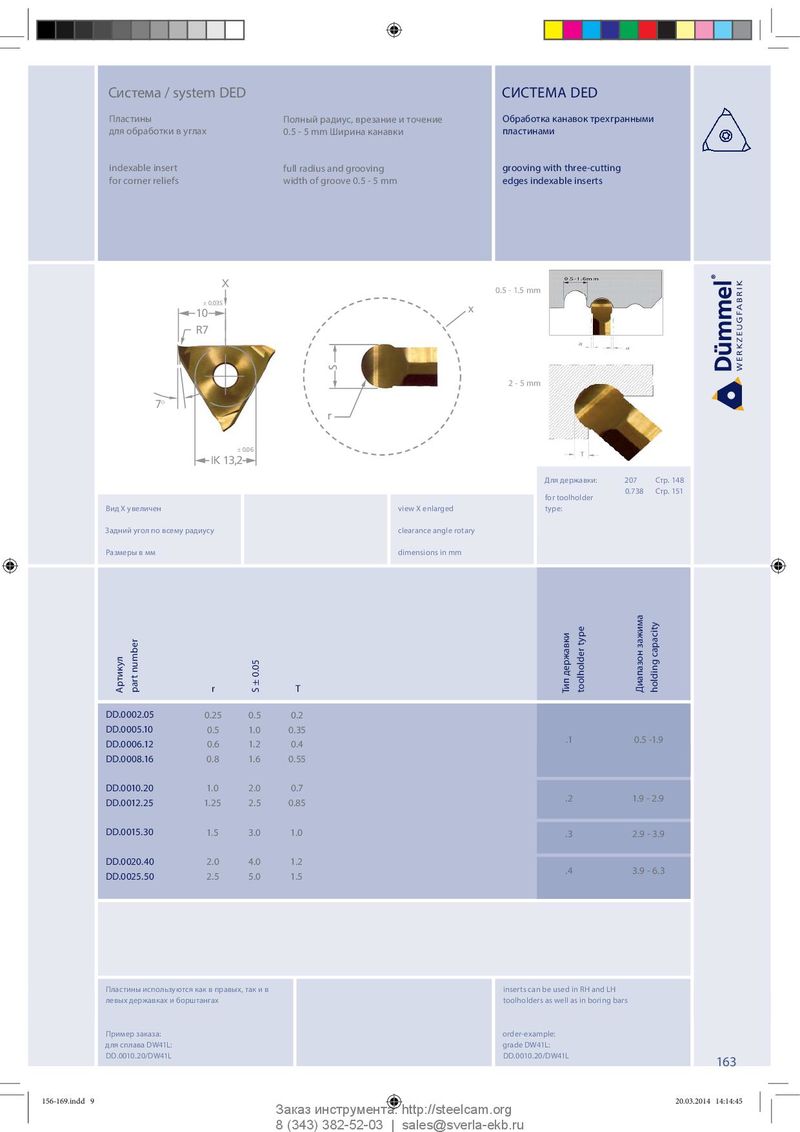 Система / system DED СИСТЕМА DED Пластины Полный радиус, врезание и точение Обработка канавок трехгранными для обработки в углах 0.5 - 5 mm Ширина канавки пластинами indexable insert full radius and grooving grooving with three-cutting for corner reliefs width of groove 0.5 - 5 mm edges indexable inserts X 0.5 - 1.5 mm ± 0.035 x 10 R7 S 2 - 5 mm 7° r ± 0.06 IK 13,2 Для державки: 207 Стр. 148 0.738 Стр. 151 for toolholder Вид Х увеличен view X enlarged type: Задний угол по всему радиусу clearance angle rotary Размеры в мм dimensions in mm capacity Артикул part number r T S ± 0.05 Тип державки toolholder type Диапазон зажима holding DD.0002.05 0.25 0.5 0.2 DD.0005.10 0.5 1.0 0.35 .1 0.5 -1.9 DD.0006.12 0.6 1.2 0.4 DD.0008.16 0.8 1.6 0.55 DD.0010.20 1.0 2.0 0.7 .2 1.9 - 2.9 DD.0012.25 1.25 2.5 0.85 DD.0015.30 1.5 3.0 1.0 .3 2.9 - 3.9 DD.0020.40 2.0 4.0 1.2 .4 3.9 - 6.3 DD.0025.50 2.5 5.0 1.5 Пластины используются как в правых, так и в inserts can be used in RH and LH левых державках и борштангах toolholders as well as in boring bars Пример заказа: order-example: для сплава DW41L: grade DW41L: DD.0010.20/DW41L DD.0010.20/DW41L 163 156-169.indd 9 156-169.indd 9 20.03.2014 14:14:45 20.03.2014 14:14:45 Заказ инструмента: http://steelcam.org 8 (343) 382-52-03 | sales@sverla-ekb.ru