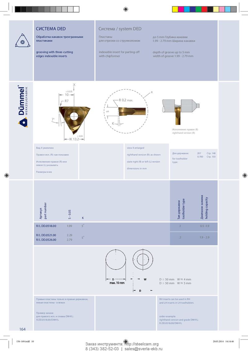 СИСТЕМА DED Система / system DED Обработка канавок трехгранными Пластины до 5 mm Глубина канавки пластинами для отрезки со стружколомом 1.99 - 2.79 mm Ширина канавки grooving with three-cutting indexable insert for parting-off depth of groove up to 5 mm edges indexable inserts with chipformer width of groove 1.99 - 2.79 mm X ± 0.035 x 10 R7 R 0.2 max. S 7° K Исполнение правое (R) righthand version (R) ± 0.06 IK 13.2 Вид Х увеличен view X enlarged Для державки: 207 Стр. 148 Правое исп. (R): как показано righthand version (R): as shown 0.780 Стр. 150 for toolholder Исполнение правое (R) или state right (R) or left (L) version type: левое (L) указывать dimensions in mm Размеры в мм capacity Артикул part number K S - 0.05 Тип державки toolholder type Диапазон зажима holding R / L D D. 0 518 . 0 0 1.99 5 ° .1 0.5 -1.9 R/L DD.0521.00 2.29 5 ° .2 1.9 - 2.9 R/L DD.0526.00 2.79 D ≧ 50 mm W ≈ 4 mm D ≦ 50 mm W ≈ 5 mm Правые пластины только в правых державках, RH inserts can be used in RH левые пластины - в левых and LH inserts in LH toolholders Пример заказа: для правого исп. и сплава DW41L: order-example: R.DD.0518.00/DW41L righthand version and grade DW41L: R.DD.0518.00/DW41L 164 156-169.indd 10 156-169.indd 10 20.03.2014 14:14:46 20.03.2014 14:14:46 Заказ инструмента: http://steelcam.org 8 (343) 382-52-03 | sales@sverla-ekb.ru