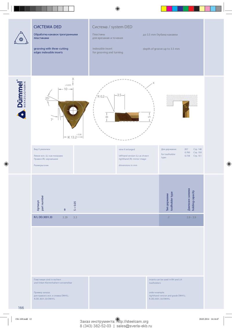 СИСТЕМА DED Система / system DED Обработка канавок трехгранными Пластины до 3.5 mm Глубина канавки пластинами для врезания и точения grooving with three-cutting indexable insert depth of groove up to 3.5 mm edges indexable inserts for grooving and turning X x ± 0.035 10 3.5 R 0.2 25° B S 7° ± 0.06 IK 13.2 Вид Х увеличен view X enlarged Для державки: 207 Стр. 148 0.780 Стр. 150 for toolholder Левое исп. (L): как показано lefthand version (L): as shown 0.738 Стр. 151 type: Правое (R): зеркальное righthand (R): mirror image Размеры в мм dimensions in mm capacity Артикул part number B S + 0.05 Тип державки toolholder type Диапазон зажима holding R/L DD.3031.33 3.29 3.3 .2 2.9 - 3.9 Пластиныn sind in rechten inserts can be used in RH and LH und linken Klemmhaltern verwendbar toolholders Пример заказа: order-example: для правого исп. и сплава DW41L: righthand version and grade DW41L: R.DD.3031.33/DW41L R.DD.3031.33/DW41L 166 156-169.indd 12 156-169.indd 12 20.03.2014 14:14:47 20.03.2014 14:14:47 Заказ инструмента: http://steelcam.org 8 (343) 382-52-03 | sales@sverla-ekb.ru