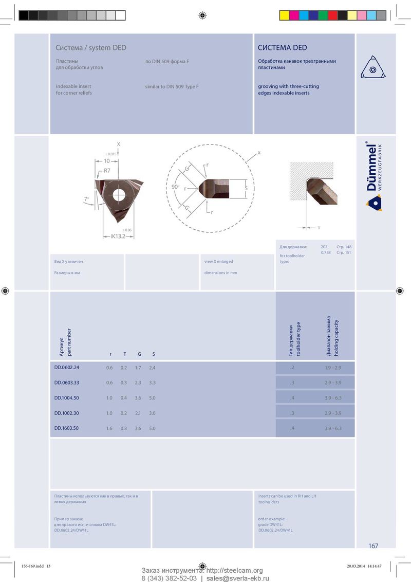 Система / system DED СИСТЕМА DED Пластины по DIN 509 форма F Обработка канавок трехгранными для обработки углов пластинами indexable insert similar to DIN 509 Type F grooving with three-cutting for corner reliefs edges indexable inserts X ± 0.035 x 10 r R7 G 90° r S 7° G r ± 0.06 IK13.2 Для державки: 207 Стр. 148 0.738 Стр. 151 for toolholder Вид Х увеличен view X enlarged type: Размеры в мм dimensions in mm capacity Артикул part number r T G S Тип державки toolholder type Диапазон зажима holding D D. 0 6 02 . 24 0.6 0.2 1.7 2.4 .2 1.9 - 2.9 DD.0603.33 0.6 0.3 2.3 3.3 .3 2.9 - 3.9 DD.1004.50 1.0 0.4 3.6 5.0 .4 3.9 - 6.3 DD.1002.30 1.0 0.2 2.1 3.0 .3 2.9 - 3.9 DD.1603.50 1.6 0.3 3.6 5.0 .4 3.9 - 6.3 Пластины используются как в правых, так и в inserts can be used in RH and LH левых державках toolholders Пример заказа: order-example: для правого исп. и сплава DW41L: grade DW41L: DD.0602.24/DW41L DD.0602.24/DW41L 167 156-169.indd 13 156-169.indd 13 20.03.2014 14:14:47 20.03.2014 14:14:47 Заказ инструмента: http://steelcam.org 8 (343) 382-52-03 | sales@sverla-ekb.ru