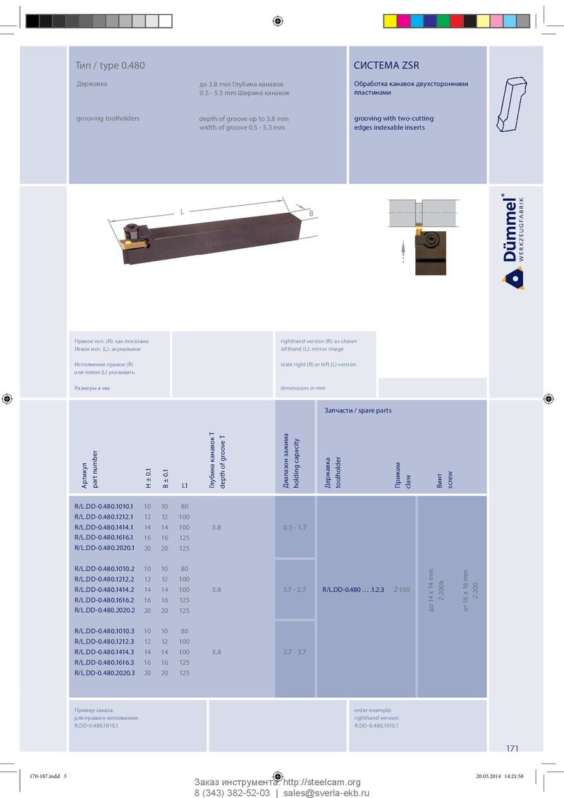 Тип / type 0.480 СИСТЕМА ZSR Державка до 3.8 mm Глубина канавок Обработка канавок двухсторонними 0.5 - 5.3 mm Ширина канавок пластинами grooving toolholders depth of groove up to 3.8 mm grooving with two-cutting width of groove 0.5 - 5.3 mm edges indexable inserts L B Правое исп. (R): как показано righthand version (R): as shown Левое исп. (L): зеркальное lefthand (L): mirror image Исполнение правое (R) state right (R) or left (L) version или левое (L) указывать Размеры в мм dimensions in mm Запчасти / spare parts Артикул part number L1 H ± 0.1 B ± 0.1 Глубина канавок T depth of groove T Диапазон зажима holding capacity Державка toolholder Прижим claw Винт screw R/L.DD-0.480.1010.1 10 10 80 R/L.DD-0.480.1212.1 12 12 100 R/L.DD-0.480.1414.1 14 14 100 3.8 0.5 - 1.7 R/L.DD-0.480.1616.1 16 16 125 R/L.DD-0.480.2020.1 20 20 125 R/L.DD-0.480.1010.2 10 10 80 R/L.DD-0.480.1212.2 12 12 100 R/L.DD-0.480.1414.2 14 14 100 3.8 1.7 - 2.7 R/L.DD-0.480 … .1.2.3 Z-100 R/L.DD-0.480.1616.2 16 16 125 Z-200k Z-200 R/L.DD-0.480.2020.2 20 20 125 до 14 x 14 mm от 16 x 16 mm R/L.DD-0.480.1010.3 10 10 80 R/L.DD-0.480.1212.3 12 12 100 R/L.DD-0.480.1414.3 14 14 100 3.8 2.7 - 3.7 R/L.DD-0.480.1616.3 16 16 125 R/L.DD-0.480.2020.3 20 20 125 Пример заказа: order-example: для правого исполнения: righthand version: R.DD-0.480.1010.1 R.DD-0.480.1010.1 171 170-187.indd 3 170-187.indd 3 20.03.2014 14:21:58 20.03.2014 14:21:58 Заказ инструмента: http://steelcam.org 8 (343) 382-52-03 | sales@sverla-ekb.ru
