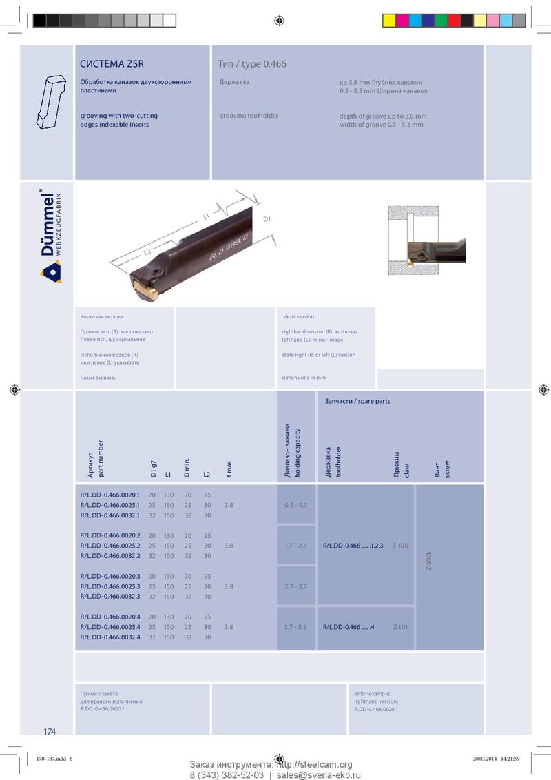 СИСТЕМА ZSR Тип / type 0.466 Обработка канавок двухсторонними Державка до 3.8 mm Глубина канавок пластинами 0.5 - 5.3 mm Ширина канавок grooving with two-cutting grooving toolholder depth of groove up to 3.8 mm edges indexable inserts width of groove 0.5 - 5.3 mm L1 D1 L2 Короткая версия short version Правое исп. (R): как показано righthand version (R): as shown Левое исп. (L): зеркальное lefthand (L): mirror image Исполнение правое (R) state right (R) or left (L) version или левое (L) указывать Размеры в мм dimensions in mm Запчасти / spare parts Артикул part number L1 L2 D1 g7 D min. t max. Диапазон зажима holding capacity Державка toolholder Прижим claw Винт screw R / L . D D - 0 . 4 6 6 . 0 02 0 .1 20 130 20 25 R/L.DD-0.466.0025.1 25 150 25 30 3.8 0.5 - 1.7 R/L.DD-0.466.0032.1 32 150 32 30 R / L . D D - 0 . 4 6 6 . 0 02 0 . 2 20 130 20 25 R/L.DD-0.466.0025.2 25 150 25 30 3.8 1.7 - 2.7 R/L.DD-0.466 … .1.2.3 Z-100 R/L.DD-0.466.0032.2 32 150 32 30 Z-200k R / L . D D - 0 . 4 6 6 . 0 02 0 . 3 20 130 20 25 R/L.DD-0.466.0025.3 25 150 25 30 3.8 2.7 - 3.7 R/L.DD-0.466.0032.3 32 150 32 30 R / L . D D - 0 . 4 6 6 . 0 02 0 . 4 20 130 20 25 R/L.DD-0.466.0025.4 25 150 25 30 3.8 3.7 - 5.3 R/L.DD-0.466 … .4 Z-101 R/L.DD-0.466.0032.4 32 150 32 30 Пример заказа: order-example: для правого исполнения: righthand version: R.DD-0.466.0020.1 R.DD-0.466.0020.1 174 170-187.indd 6 170-187.indd 6 20.03.2014 14:21:59 20.03.2014 14:21:59 Заказ инструмента: http://steelcam.org 8 (343) 382-52-03 | sales@sverla-ekb.ru