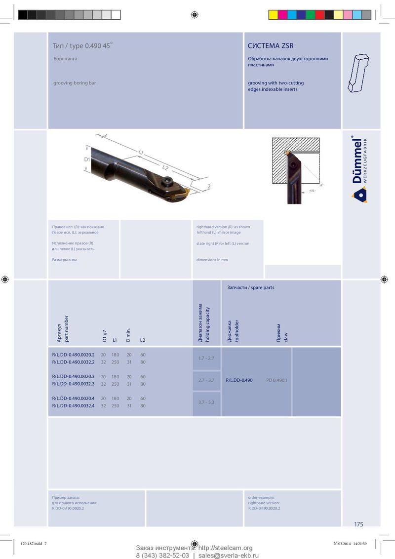 Тип / type 0.490 45 ° СИСТЕМА ZSR Борштанга Обработка канавок двухсторонними пластинами grooving boring bar grooving with two-cutting edges indexable inserts L1 D1 L2 2 Правое исп. (R): как показано righthand version (R): as shown Левое исп. (L): зеркальное lefthand (L): mirror image Исполнение правое (R) state right (R) or left (L) version или левое (L) указывать Размеры в мм dimensions in mm Запчасти / spare parts Артикул part number L1 L2 D1 g7 D min. Диапазон зажима holding capacity Державка toolholder Прижим claw R / L . D D - 0 . 49 0 . 0 020 . 2 20 180 20 60 1.7 - 2.7 R/L.DD-0.490.0032.2 32 250 31 80 R / L . D D - 0 . 49 0 . 0 020 . 3 20 180 20 60 2.7 - 3.7 R/L.DD-0.490 PD 0.490.1 R/L.DD-0.490.0032.3 32 250 31 80 R / L . D D - 0 . 49 0 . 0 02 0 . 4 20 180 20 60 3.7 - 5.3 R/L.DD-0.490.0032.4 32 250 31 80 Пример заказа: order-example: для правого исполнения: righthand version: R.DD-0.490.0020.2 R.DD-0.490.0020.2 175 170-187.indd 7 170-187.indd 7 20.03.2014 14:21:59 20.03.2014 14:21:59 Заказ инструмента: http://steelcam.org 8 (343) 382-52-03 | sales@sverla-ekb.ru