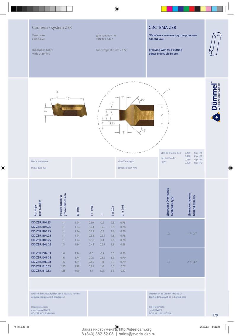 Система / system ZSR СИСТЕМА ZSR Пластины для канавок по Обработка канавок двухсторонними с фасками DIN 471 / 472 пластинами indexable insert for circlips DIN 471 / 472 grooving with two-cutting with chamfers edges indexable inserts x X 17 T1 45 ° 3° 5 B S a1 3° 45° T Для державки тип: 0.480 Стр. 171 0.460 Стр. 173 for toolholder 0.466 Стр. 174 Вид Х увеличен view X enlarged type: 0.490 Стр. 175 Размеры в мм dimensions in mm capacity Артикул part number T Размер канавки groove dimension B - 0.05 T1 - 0.05 S ± 0.02 a1 ± 0.02 Державка Окончание toolholder type Диапазон зажима holding DD-ZSR.1101.25 1.1 1.24 0.19 0.2 2.8 0.78 DD-ZSR.1102.25 1.1 1.24 0.24 0.25 2.8 0.78 DD-ZSR.1103.25 1.1 1.24 0.29 0.3 2.8 0.78 .2 1.7 - 2.7 DD-ZSR.1104.25 1.1 1.24 0.33 0.35 2.8 0.78 DD-ZSR.1105.25 1.1 1.24 0.36 0.4 2.8 0.78 DD-ZSR.1306.25 1.3 1.44 0.45 0.55 2.8 0.68 D D -Z S R .16 07. 33 1.6 1.74 0.6 0.7 3.3 0.79 DD-ZSR.1608.33 1.6 1.74 0.75 0.85 3.3 0.79 DD-ZSR.1609.33 1.6 1.74 0.85 1.0 3.3 0.79 .3 2.7 - 3.7 DD-ZSR.1810.33 1.85 1.99 0.85 1.0 3.3 0.67 DD-ZSR.1812.33 1.85 1.99 1.1 1.25 3.3 0.67 Пластины используются как в правых, так и в inserts can be used in RH and LH левых державках и борштангах toolholders as well as in boring bars Пример заказа: order-example: для сплава DW41L: grade DW41L: DD-ZSR.1101.25/DW41L DD-ZSR.1101.25/DW41L 179 170-187.indd 11 170-187.indd 11 20.03.2014 14:22:01 20.03.2014 14:22:01 Заказ инструмента: http://steelcam.org 8 (343) 382-52-03 | sales@sverla-ekb.ru