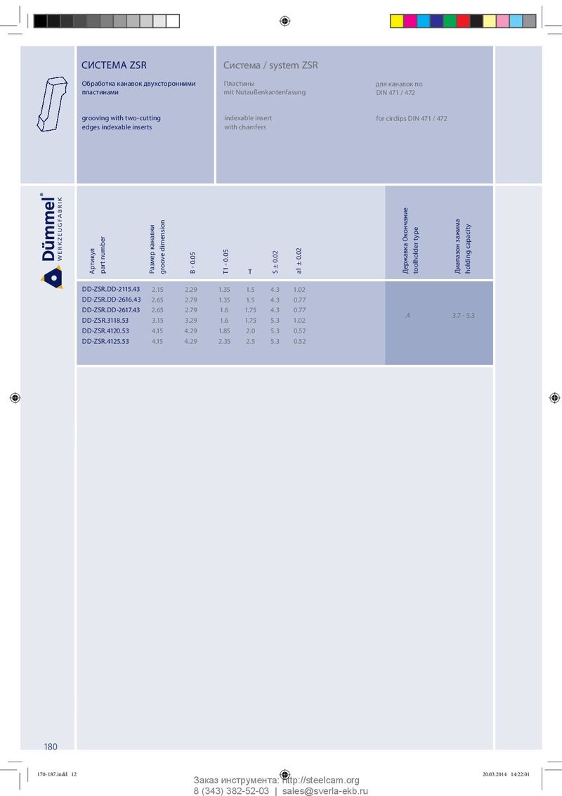 СИСТЕМА ZSR Система / system ZSR Обработка канавок двухсторонними Пластины для канавок по пластинами mit Nutaußenkantenfasung DIN 471 / 472 grooving with two-cutting indexable insert for circlips DIN 471 / 472 edges indexable inserts with chamfers capacity Артикул part number T Размер канавки groove dimension B - 0.05 T1 - 0.05 S ± 0.02 a1 ± 0.02 Державка Окончание toolholder type Диапазон зажима holding DD-ZSR.DD-2115.43 2.15 2.29 1.35 1.5 4.3 1.02 DD-ZSR.DD-2616.43 2.65 2.79 1.35 1.5 4.3 0.77 DD-ZSR.DD-2617.43 2.65 2.79 1.6 1.75 4.3 0.77 .4 3.7 - 5.3 DD-ZSR.3118.53 3.15 3.29 1.6 1.75 5.3 1.02 DD-ZSR.4120.53 4.15 4.29 1.85 2.0 5.3 0.52 DD-ZSR.4125.53 4.15 4.29 2.35 2.5 5.3 0.52 180 170-187.indd 12 170-187.indd 12 20.03.2014 14:22:01 20.03.2014 14:22:01 Заказ инструмента: http://steelcam.org 8 (343) 382-52-03 | sales@sverla-ekb.ru