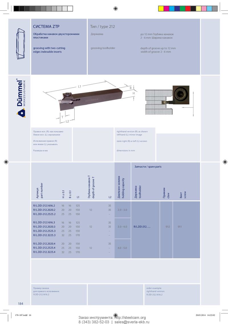 СИСТЕМА ZTP Тип / type 212 Обработка канавок двухсторонними Державка д о 12 m m Гл у б и н а к а н а в о к пластинами 2 - 6 mm Ширина канавок grooving with two-cutting grooving toolholder depth of groove up to 12 mm edges indexable inserts width of groove 2 - 6 mm L1 B H T L2 Правое исп. (R): как показано righthand version (R): as shown Левое исп. (L): зеркальное lefthand (L): mirror image Исполнение правое (R) state right (R) or left (L) version или левое (L) указывать Размеры в мм dimensions in mm Запчасти / spare parts Артикул part number L1 L2 H ± 0.1 B ± 0.1 Глубина канавок T depth of groove T Диапазон зажима holding capacity Державка toolholder Прижим claw Винт screw R/L.DD-212.1616.2 16 16 125 35 R/L.DD-212.2020.2 20 20 150 12 35 2.0 - 3.0 R/L.DD-212.2525.2 25 25 150 – R/L.DD-212.1616.3 16 16 125 35 R/L.DD-212.2020.3 20 20 150 12 35 3.0 - 4.0 R/L.DD-212. … 912 911 R/L.DD-212.2525.3 25 25 150 – R/L.DD-212.3225.3 32 25 170 – R/L.DD-212.2020.4 20 20 150 35 R/L.DD-212.2525.4 25 25 150 12 – 4.0 - 5.0 R/L.DD-212.3225.4 32 25 170 – Пример заказа: order-example: для правого исполнения: righthand version: R.DD-212.1616.2 R.DD-212.1616.2 184 170-187.indd 16 170-187.indd 16 20.03.2014 14:22:02 20.03.2014 14:22:02 Заказ инструмента: http://steelcam.org 8 (343) 382-52-03 | sales@sverla-ekb.ru