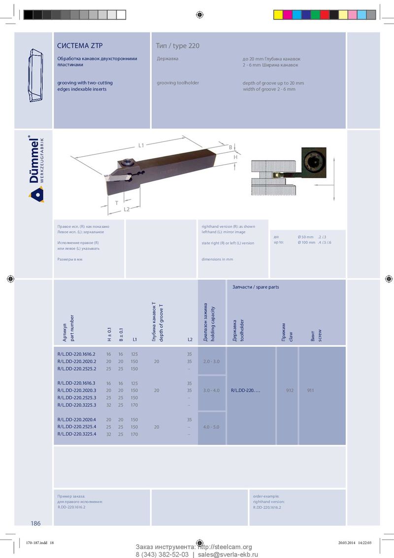 СИСТЕМА ZTP Тип / type 220 Обработка канавок двухсторонними Державка д о 2 0 m m Гл у б и н а к а н а в о к пластинами 2 - 6 mm Ширина канавок grooving with two-cutting grooving toolholder depth of groove up to 20 mm edges indexable inserts width of groove 2 - 6 mm L1 B H T L2 Правое исп. (R): как показано righthand version (R): as shown Левое исп. (L): зеркальное lefthand (L): mirror image до: Ø 50 mm .2 /.3 Исполнение правое (R) state right (R) or left (L) version up to: Ø 100 mm .4 /.5 /.6 или левое (L) указывать Размеры в мм dimensions in mm Запчасти / spare parts Артикул part number L1 L2 H ± 0.1 B ± 0.1 Глубина канавок T depth of groove T Диапазон зажима holding capacity Державка toolholder Прижим claw Винт screw R/L.DD-220.1616.2 16 16 125 35 R/L.DD-220.2020.2 20 20 150 20 35 2.0 - 3.0 R/L.DD-220.2525.2 25 25 150 – R/L.DD-220.1616.3 16 16 125 35 R/L.DD-220.2020.3 20 20 150 20 35 3.0 - 4.0 R/L.DD-220. … 912 911 R/L.DD-220.2525.3 25 25 150 – R/L.DD-220.3225.3 32 25 170 – R/L.DD-220.2020.4 20 20 150 35 R/L.DD-220.2525.4 25 25 150 20 – 4.0 - 5.0 R/L.DD-220.3225.4 32 25 170 – Пример заказа: order-example: для правого исполнения: righthand version: R.DD-220.1616.2 R.DD-220.1616.2 186 170-187.indd 18 170-187.indd 18 20.03.2014 14:22:03 20.03.2014 14:22:03 Заказ инструмента: http://steelcam.org 8 (343) 382-52-03 | sales@sverla-ekb.ru