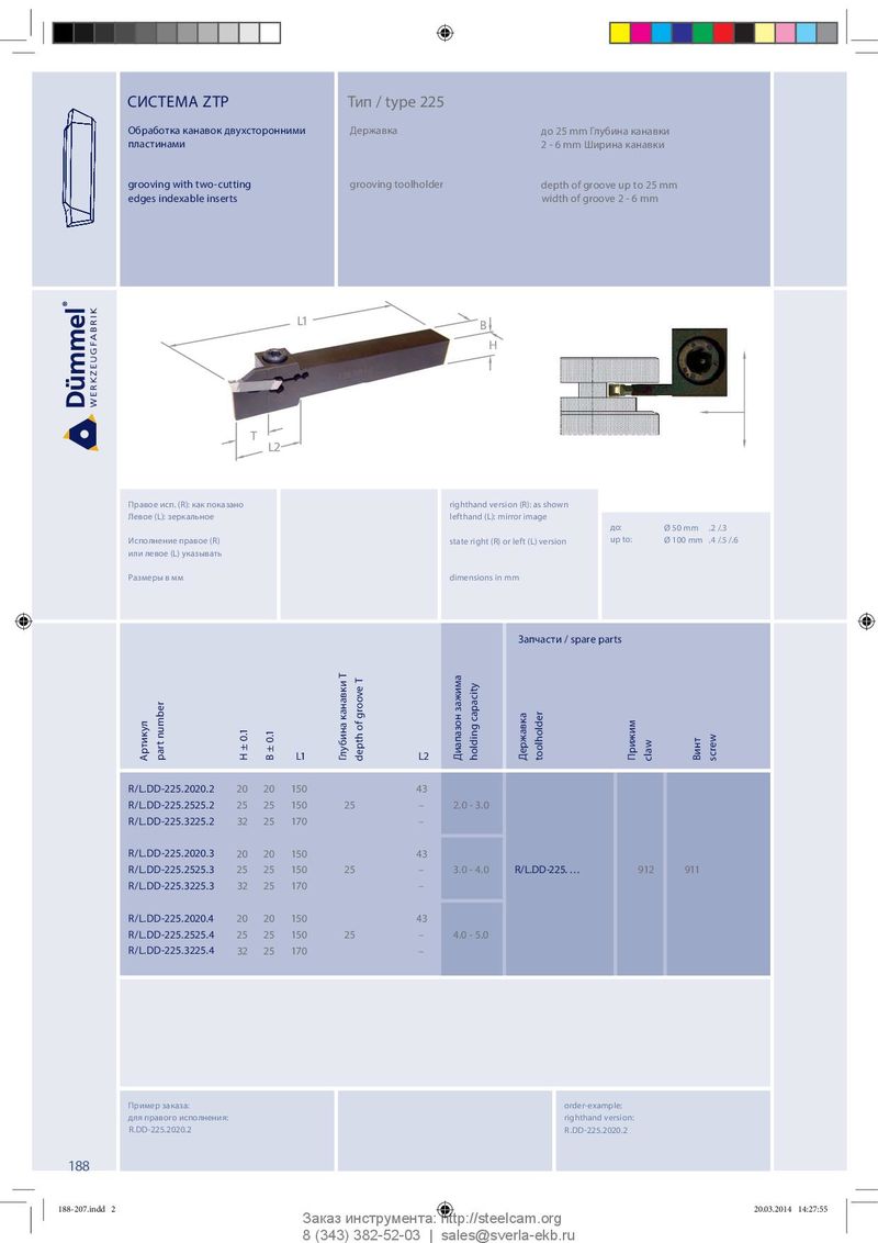 СИСТЕМА ZTP Тип / type 225 Обработка канавок двухсторонними Державка д о 2 5 m m Гл у б и н а к а н а в к и пластинами 2 - 6 mm Ширина канавки grooving with two-cutting grooving toolholder depth of groove up to 25 mm edges indexable inserts width of groove 2 - 6 mm L1 B H T L2 Правое исп. (R): как показано righthand version (R): as shown Левое (L): зеркальное lefthand (L): mirror image до: Ø 50 mm .2 /.3 Исполнение правое (R) state right (R) or left (L) version up to: Ø 100 mm .4 /.5 /.6 или левое (L) указывать Размеры в мм dimensions in mm Запчасти / spare parts Артикул part number L1 L2 H ± 0.1 B ± 0.1 Глубина канавки T depth of groove T Диапазон зажима holding capacity Державка toolholder Прижим claw Винт screw R/L.DD-225.2020.2 20 20 150 43 R/L.DD-225.2525.2 25 25 150 25 – 2.0 - 3.0 R/L.DD-225.3225.2 32 25 170 – R/L.DD-225.2020.3 20 20 150 43 R/L.DD-225.2525.3 25 25 150 25 – 3.0 - 4.0 R/L.DD-225. … 912 911 R/L.DD-225.3225.3 32 25 170 – R/L.DD-225.2020.4 20 20 150 43 R/L.DD-225.2525.4 25 25 150 25 – 4.0 - 5.0 R/L.DD-225.3225.4 32 25 170 – Пример заказа: order-example: для правого исполнения: righthand version: R.DD-225.2020.2 R.DD-225.2020.2 188 188-207.indd 2 188-207.indd 2 20.03.2014 14:27:55 20.03.2014 14:27:55 Заказ инструмента: http://steelcam.org 8 (343) 382-52-03 | sales@sverla-ekb.ru