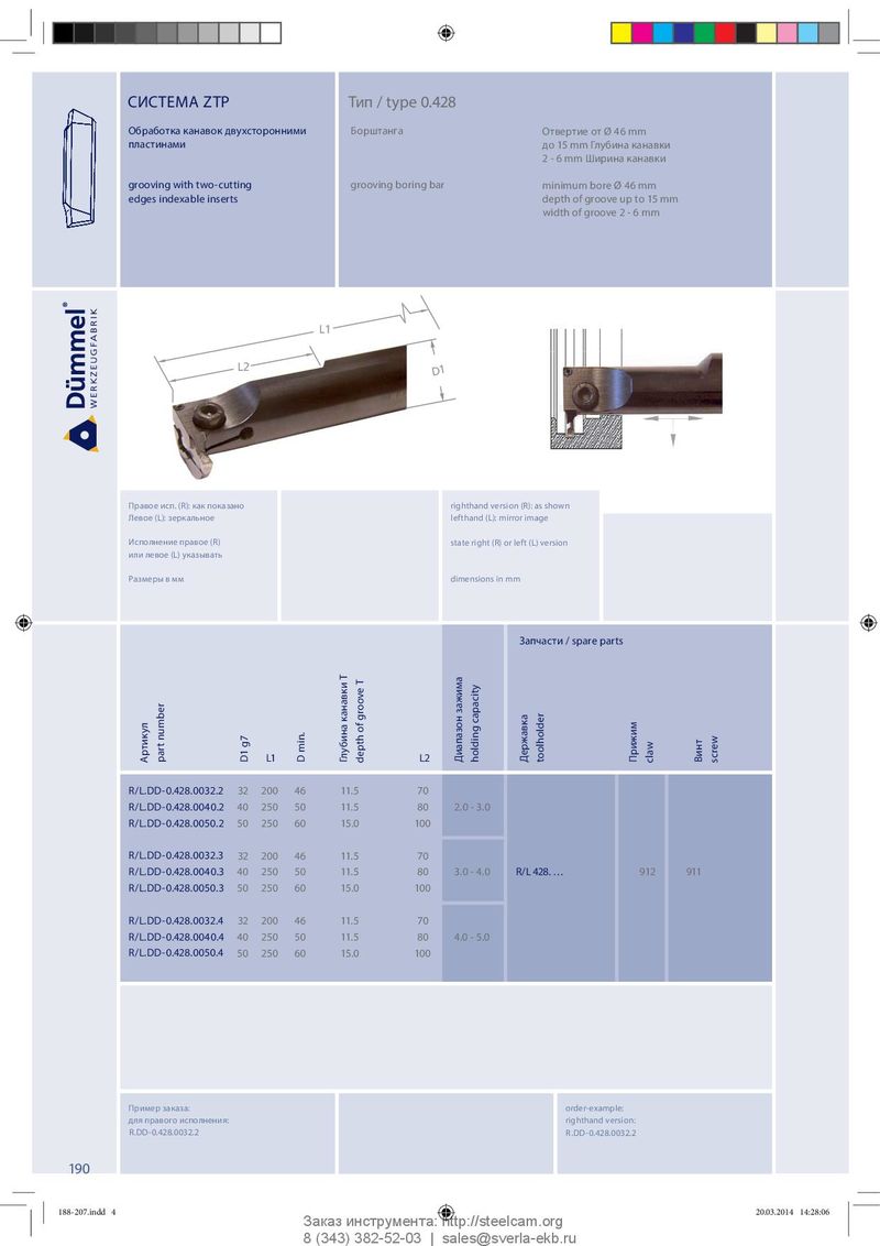 СИСТЕМА ZTP Тип / type 0.428 Обработка канавок двухсторонними Борштанга О т в е р т и е о т Ø 4 6 m m пластинами до 15 mm Глубина канавки 2 - 6 mm Ширина канавки grooving with two-cutting grooving boring bar minimum bore Ø 46 mm edges indexable inserts depth of groove up to 15 mm width of groove 2 - 6 mm L1 L2 D1 Правое исп. (R): как показано righthand version (R): as shown Левое (L): зеркальное lefthand (L): mirror image Исполнение правое (R) state right (R) or left (L) version или левое (L) указывать Размеры в мм dimensions in mm Запчасти / spare parts Артикул part number L1 L2 D1 g7 D min. Глубина канавки T depth of groove T Диапазон зажима holding capacity Державка toolholder Прижим claw Винт screw R/L.DD-0.428.0032.2 32 200 46 11.5 70 R/L.DD-0.428.0040.2 40 250 50 11.5 80 2.0 - 3.0 R/L.DD-0.428.0050.2 50 250 60 15.0 100 R/L.DD-0.428.0032.3 32 200 46 11.5 70 R/L.DD-0.428.0040.3 40 250 50 11.5 80 3.0 - 4.0 R/L 428. … 912 911 R/L.DD-0.428.0050.3 50 250 60 15.0 100 R/L.DD-0.428.0032.4 32 200 46 11.5 70 R/L.DD-0.428.0040.4 40 250 50 11.5 80 4.0 - 5.0 R/L.DD-0.428.0050.4 50 250 60 15.0 100 Пример заказа: order-example: для правого исполнения: righthand version: R.DD-0.428.0032.2 R.DD-0.428.0032.2 190 188-207.indd 4 188-207.indd 4 20.03.2014 14:28:06 20.03.2014 14:28:06 Заказ инструмента: http://steelcam.org 8 (343) 382-52-03 | sales@sverla-ekb.ru