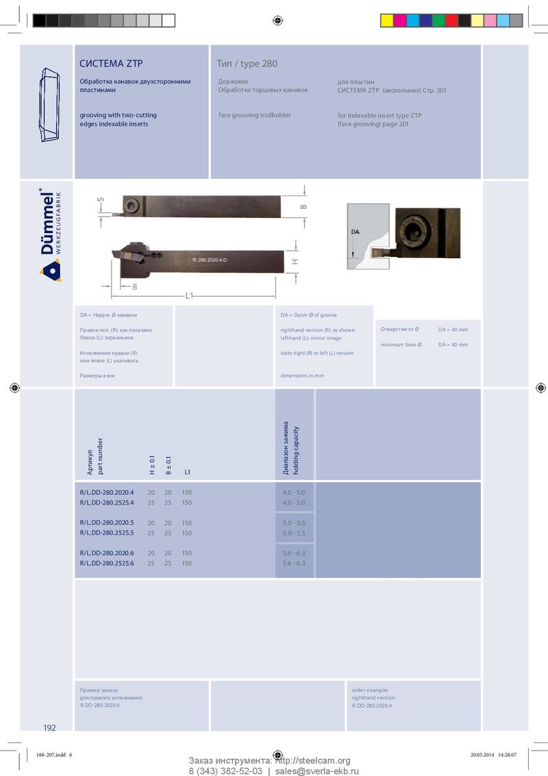 СИСТЕМА ZTP Тип / type 280 Обработка канавок двухсторонними Державка д л я п л а с т и н пластинами Обработка торцовых канавок СИСТЕМА ZTP (аксиальных) Стр. 201 grooving with two-cutting face grooving toolholder for indexable insert type ZTP edges indexable inserts (face grooving) page 201 H 8 L1 DA = Наруж. Ø канавки DA = Outer-Ø of groove Правое исп. (R): как показано righthand version (R): as shown Отверстие от Ø DA = 40 mm Левое (L): зеркальное lefthand (L): mirror image minimum bore Ø DA = 40 mm Исполнение правое (R) state right (R) or left (L) version или левое (L) указывать Размеры в мм dimensions in mm Артикул part number L1 H ± 0.1 B ± 0.1 Диапазон зажима holding capacity R/L.DD-280.2020.4 20 20 150 4.0 - 5.0 R/L.DD-280.2525.4 25 25 150 4.0 - 5.0 R/L.DD-280.2020.5 20 20 150 5.0 - 5.5 R/L.DD-280.2525.5 25 25 150 5.0 - 5.5 R/L.DD-280.2020.6 20 20 150 5.6 - 6.3 R/L.DD-280.2525.6 25 25 150 5.6 - 6.3 Пример заказа: order-example: для правого исполнения: righthand version: R.DD-280.2020.4 R.DD-280.2020.4 192 188-207.indd 6 188-207.indd 6 20.03.2014 14:28:07 20.03.2014 14:28:07 Заказ инструмента: http://steelcam.org 8 (343) 382-52-03 | sales@sverla-ekb.ru